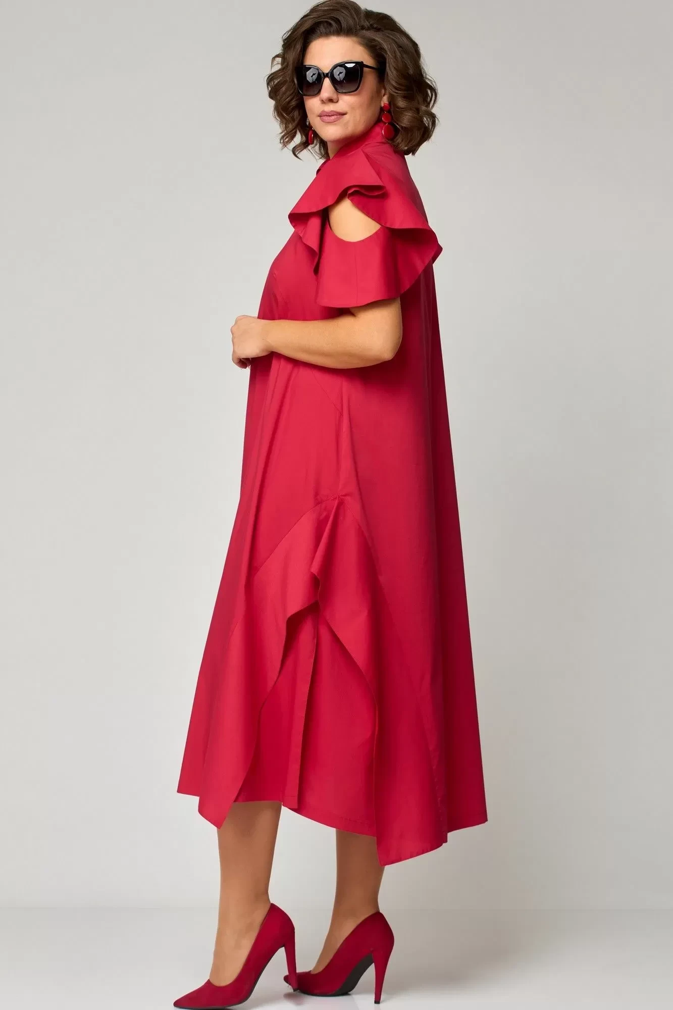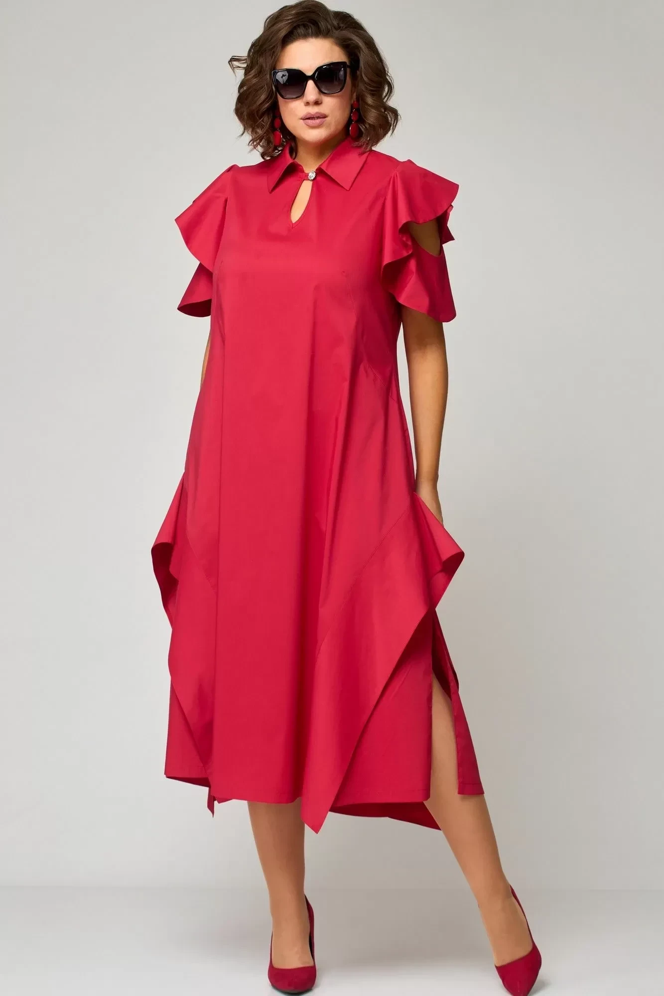 Платье женское нарядно-повседневное полуприлегающего силуэта расширенное к низу с ассиметричными воланами по боковым швам. Вырез горловины воротник на стойке рубашечного типа по центру с отделочным элементом и навесной петлей и пуговицей. Рукав втачной "Фэнтези" в виде крылышка частично с открытым плеом. В боковх швах обработаны карманы разрезы. Декором платья служит пуговица отделочная со стразами и фигурные воланы по низу и боковым платья.