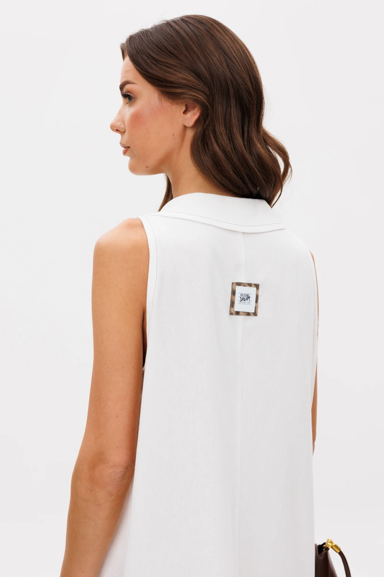 "Стиль минимализм уже несколько сезонов на пике модных трендов, как продолжение эстетики 60-х. Лаконичное платье А-силуэта, выполненное из натурального льняного полотна с вискозой, нейтрального белого цвета с контрастными широкими строчками и пуговицами. Минимализм деталей, ничего лишнего, трендовая длина мини. Легкий А-силуэт, английская пройма, круглый воротник и центральная застежка. Полочки с нагрудной вытачкой и накладным карманом с клапаном. Спинка со средним швом и отделочной эмблемой-нашивкой.