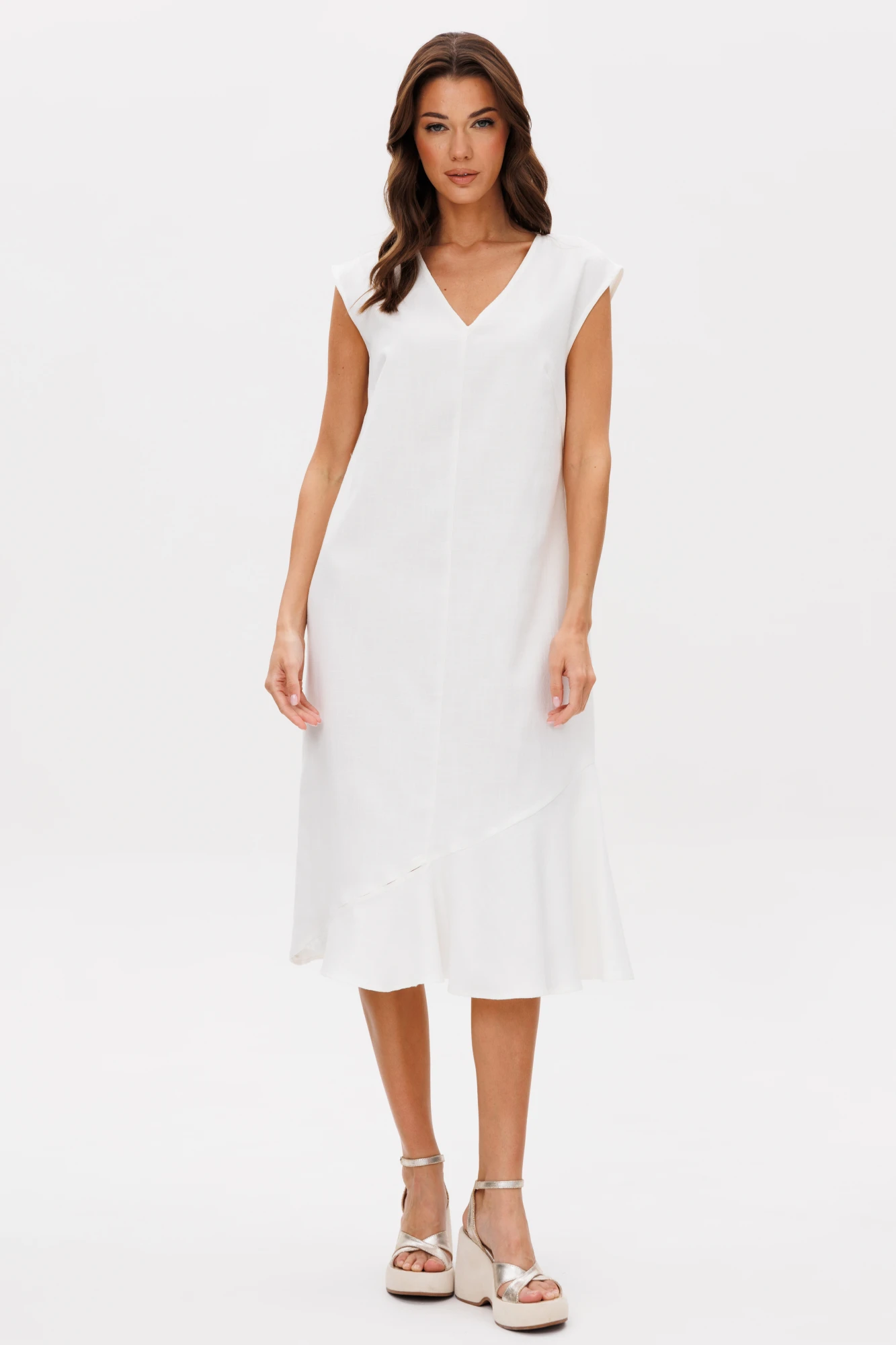 "Один из качественных и загадочных материалов для женской одежды является лён. Его отличает структура. которая выглядит стильно, строго и элегантно одновременно. А платье из льна - это идеальный выбор для летнего гардероба, особенно когда оно в изысканном белом цвете.