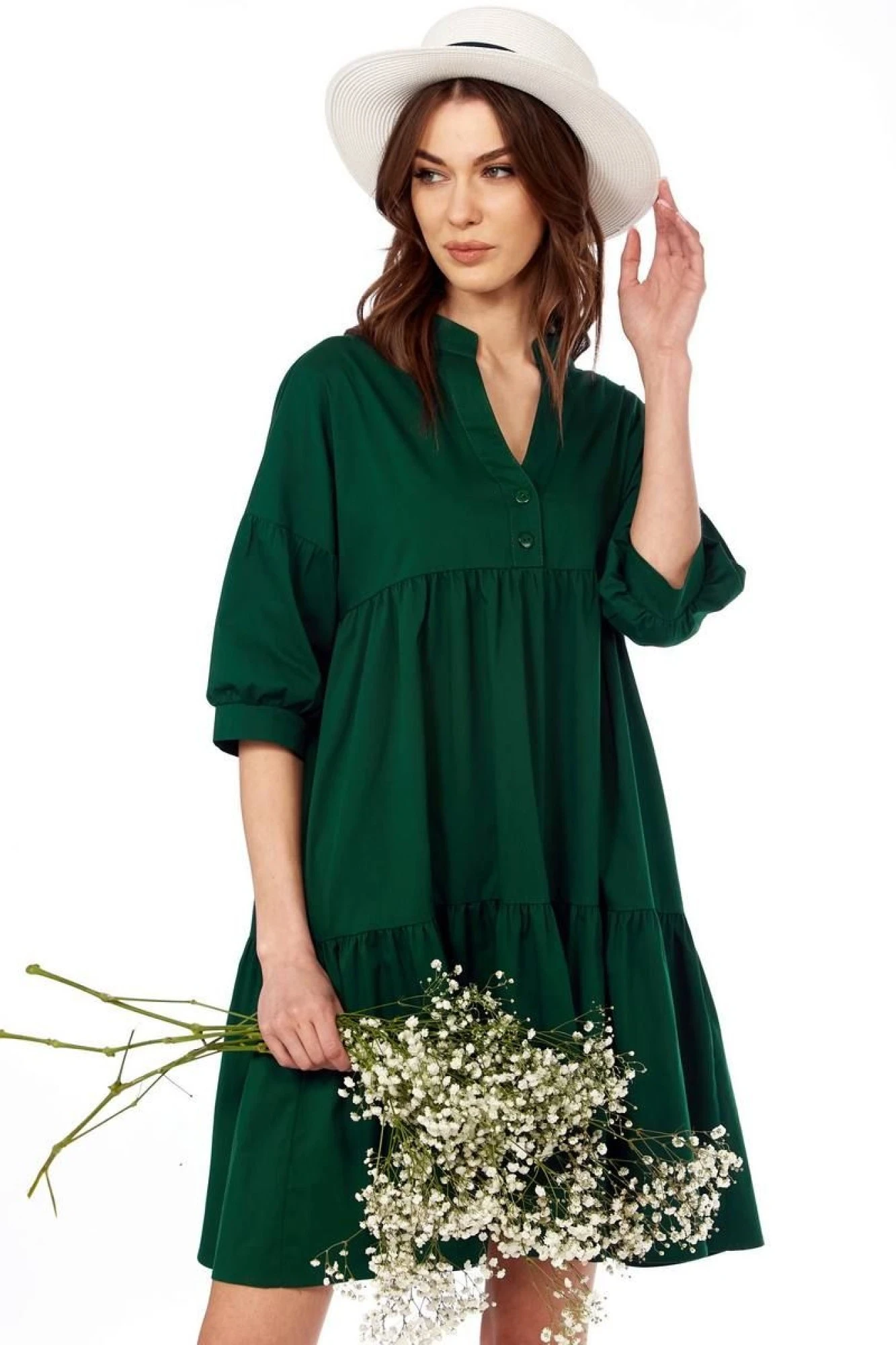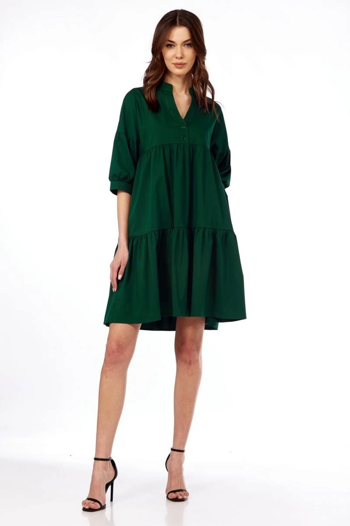 Платье женское, свободного силуэта, с застежкой на две пуговицы в верхней части переда. Передняя и задняя часть платья с двумя отрезами и мелкой сборкой по всему изделию, в боковых швах карманы.