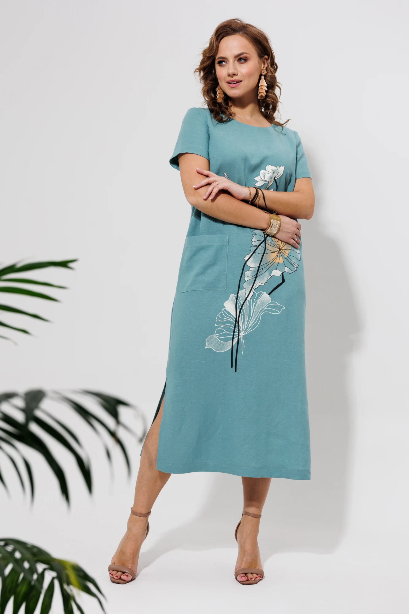 "Платье женское слегка расклешённое к низу, льняное.