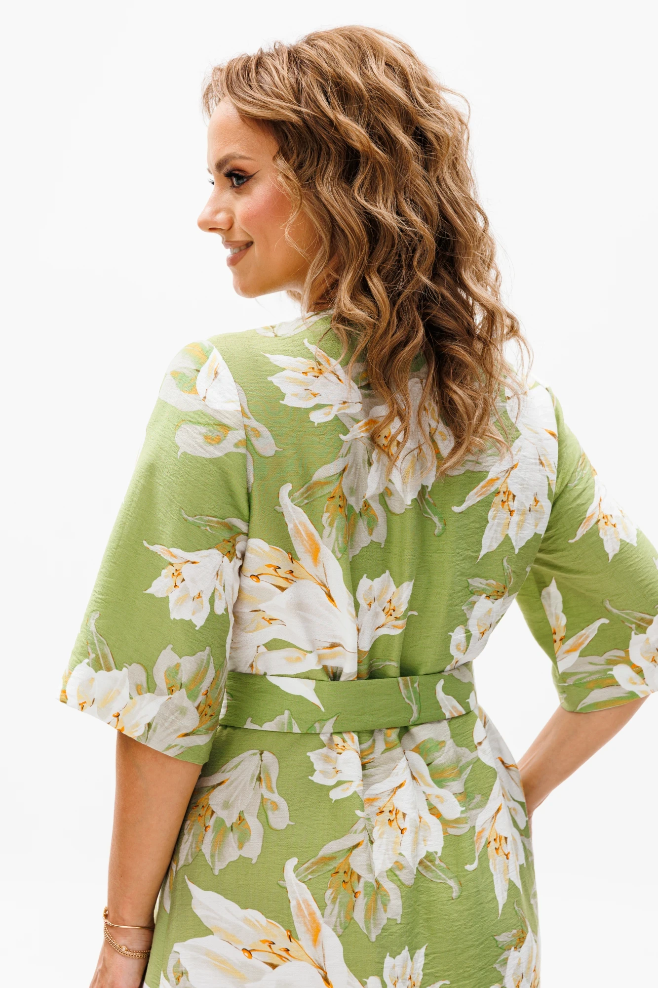 Платье А-образного силуэта из летней плательной ткани. Перед с нагрудными вытачками. Застежка центральная на петли и пуговицы. Рукав втачной одношовный. Горловина V-образной формы. К платью прилагается пояс из основной ткани с пластиковой пряжкой. Фурнитура может быть изменена с сохранением художественного образа. Длина платья - 125 см, длина рукава платья - 34 см.