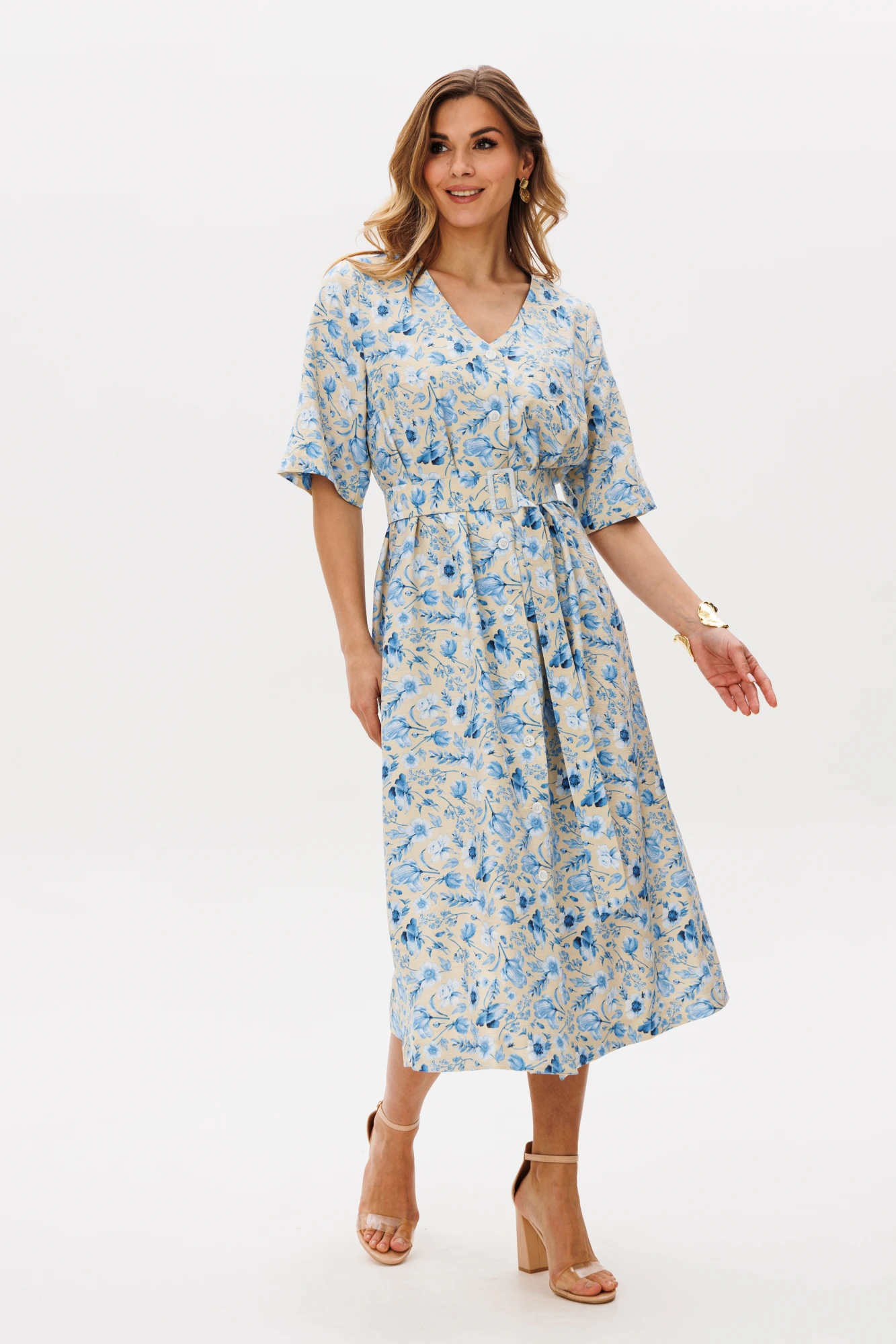 Платье А-образного силуэта из летней плательной ткани. Перед с нагрудными вытачками. Застежка центральная на петли и пуговицы. Рукав втачной одношовный. Горловина V-образной формы. К платью прилагается пояс из основной ткани с пластиковой пряжкой. Фурнитура может быть изменена с сохранением художественного образа.