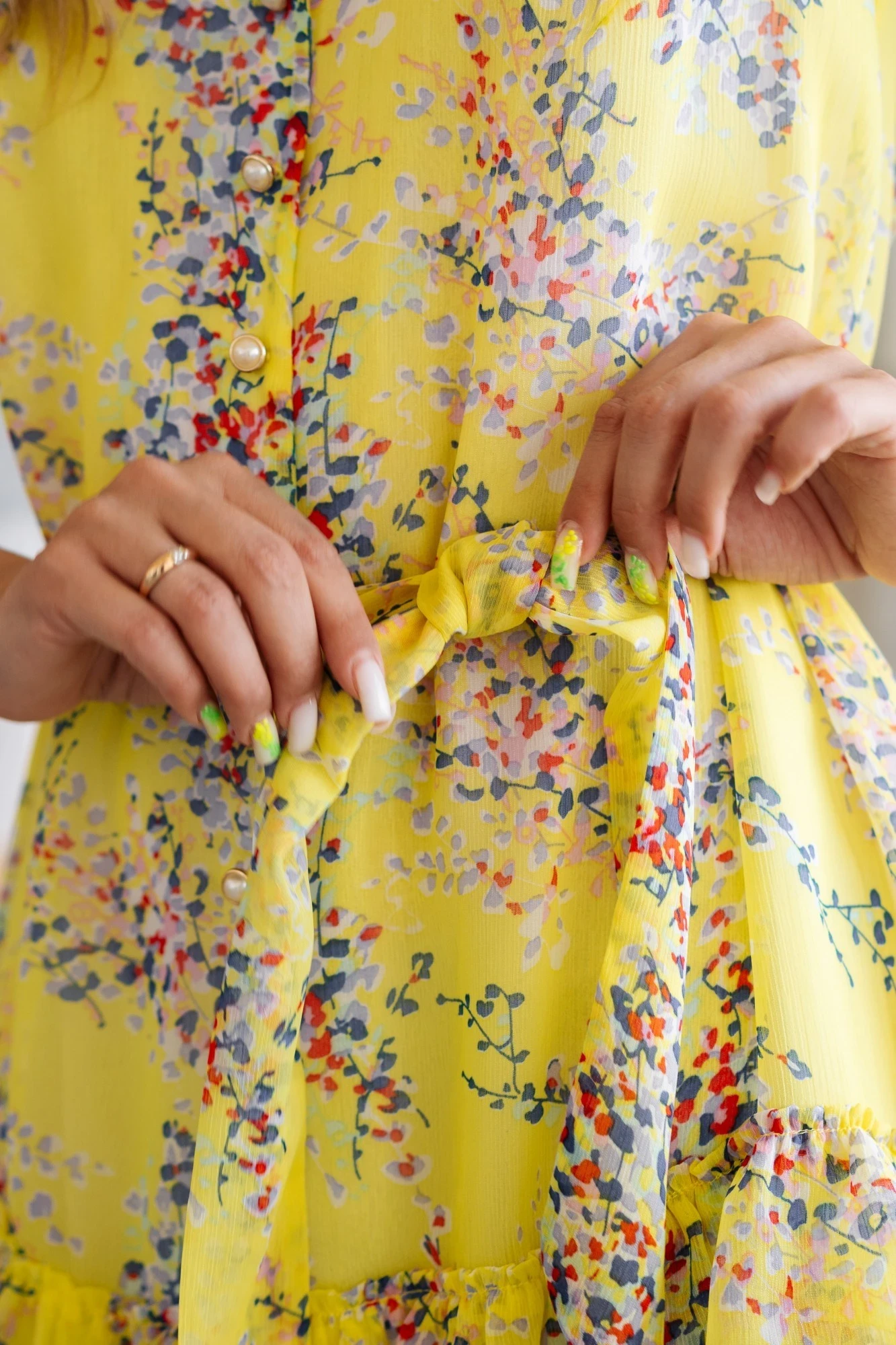 "Представляем вашему вниманию наше летнее платье из нежного шифона! Оно выполнено в классическом V-образном вырезе и имеет короткий рукав. Подкладка из хлопка обеспечивает комфорт в носке и не допускает просвечивания тела. Застегивается платье на пуговицы, а два ряда воланов добавляют образу женственности и легкости. Длина платья до колен позволяет сочетать его с любой обувью и создавать разные образы в зависимости от случая. В комплект входит пояс, который подчеркнет вашу талию и добавит образу изюминку.