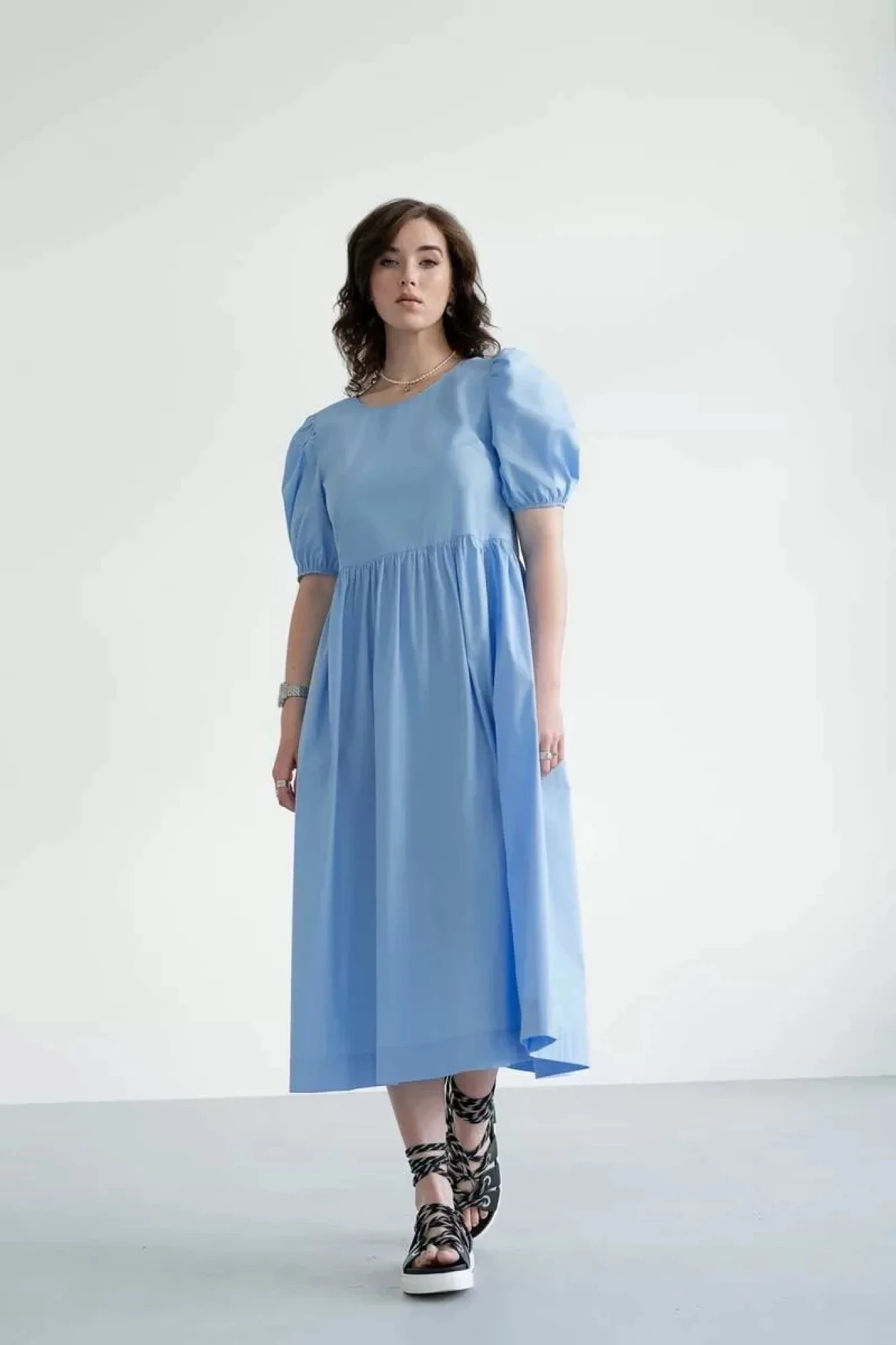 Платье молодежное женское трапециевидного силуэта из ткани хлопок,отрезное чуть выше линии талии ,с рукавом с сборкой по окату и по низу на эластичной тесьме.В боковых швах карманы .С завязками по центру спинки. Удобство и легкость ,некоторая наивность и простота актуально и современно.