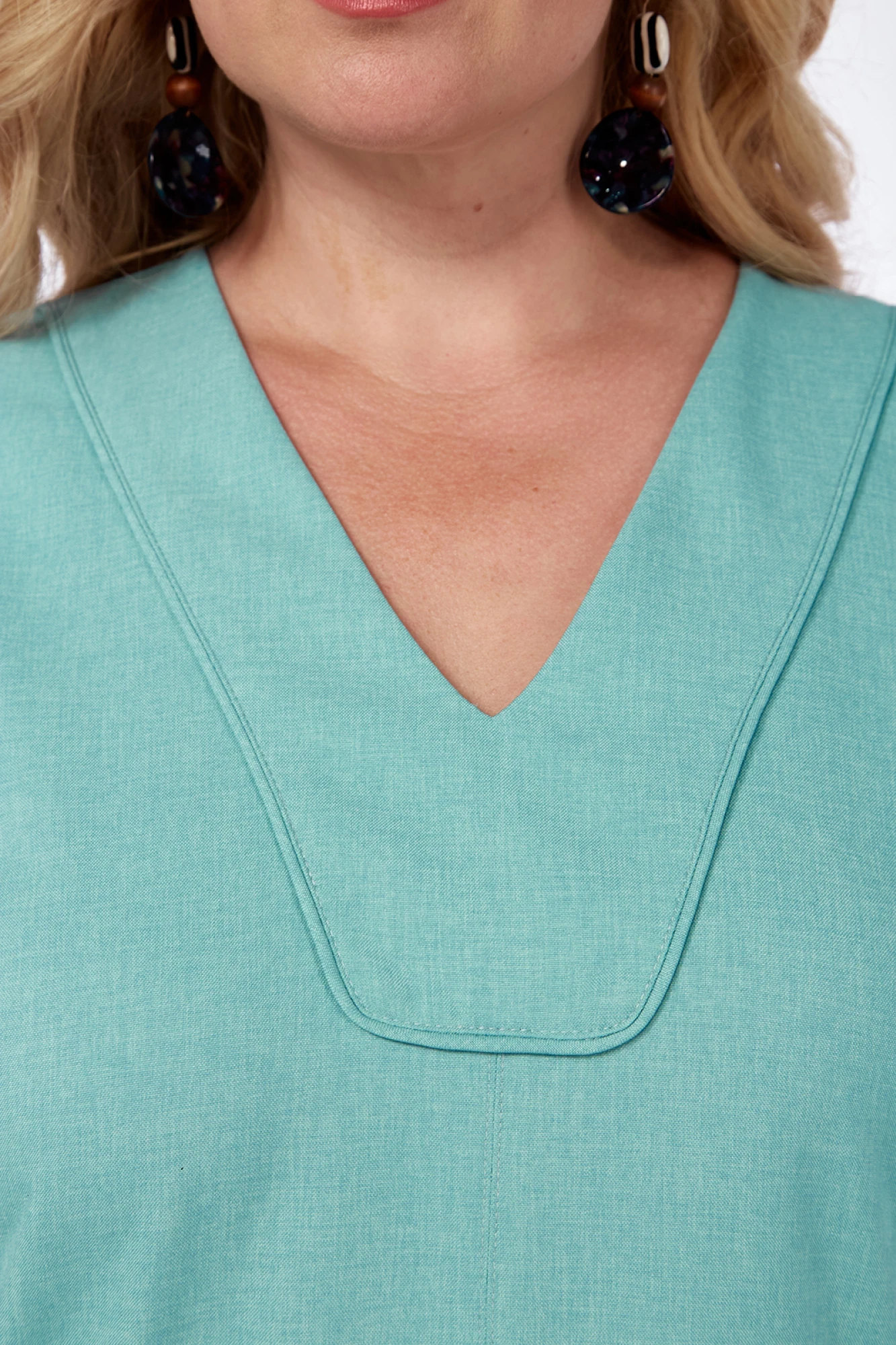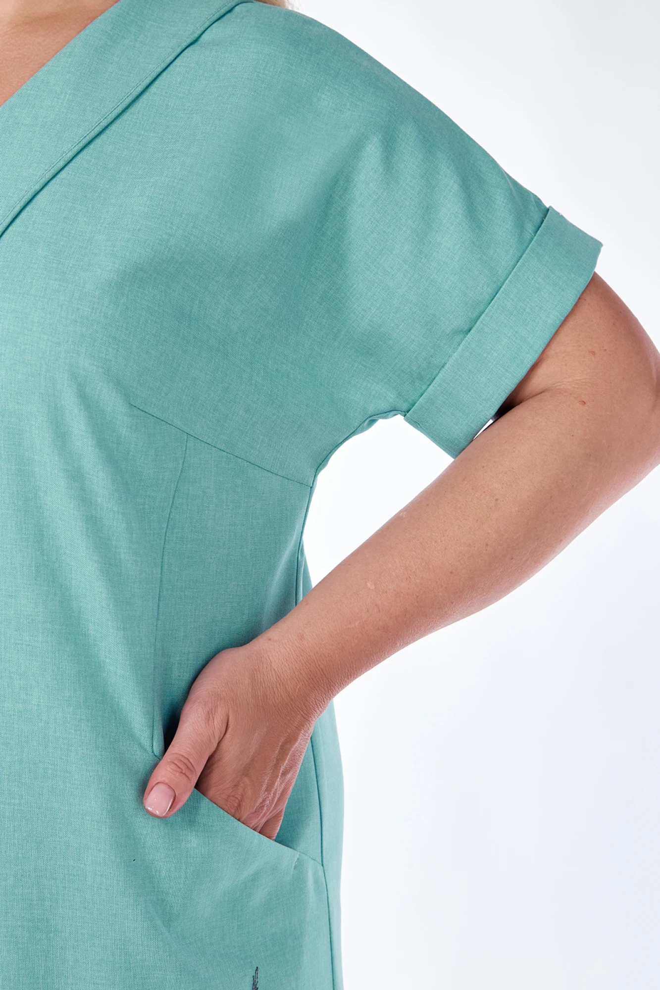 Платье женское повседневное, свободного силуэта, изготовлено из плотной плательной ткани. Перед разрезной с разрезом по центру. В фигурных рельефах обработаны карманы. Горловина с декоративной планкой. Спинка со средним швом. Рукава спущенные с отложными манжетами. Платье декорировано дизайнерской вышивкой.