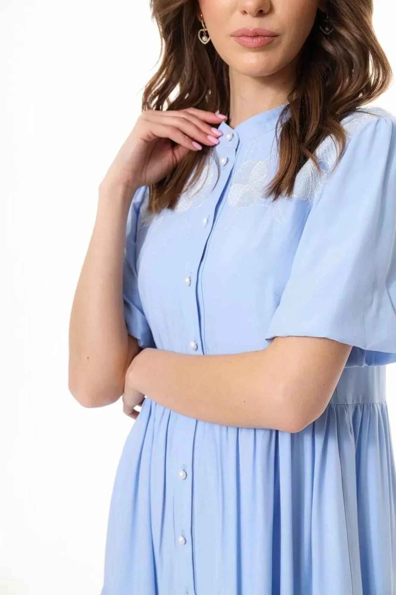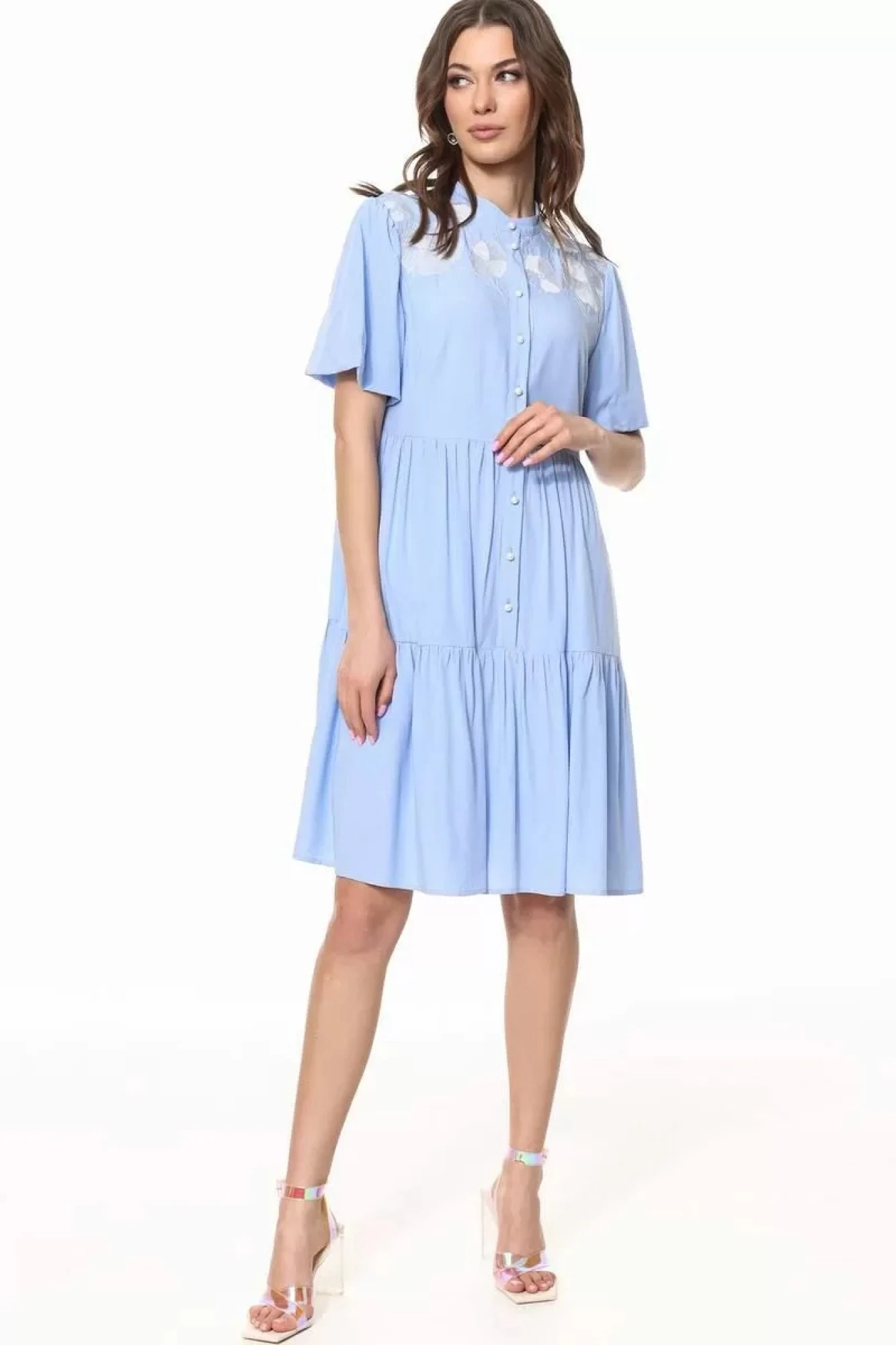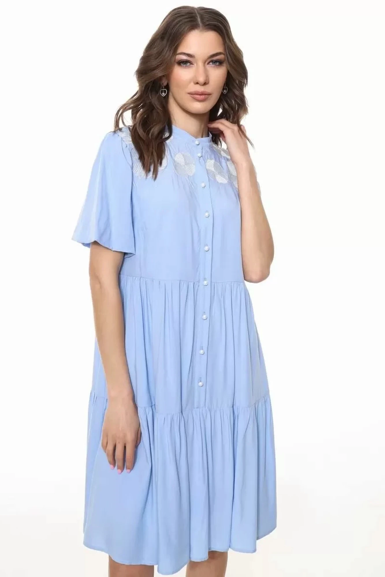 "Платье женское, расширенное к низу, с завышенной линией талии. Перед декорирован авторской вышикой, обработана планка с застежкой на петли-пуговицы. Юбка платья состоит из двух ярусов. Горловина обработана воротником-стойкой. Рукав ""фонарик"" втачной, короткий.