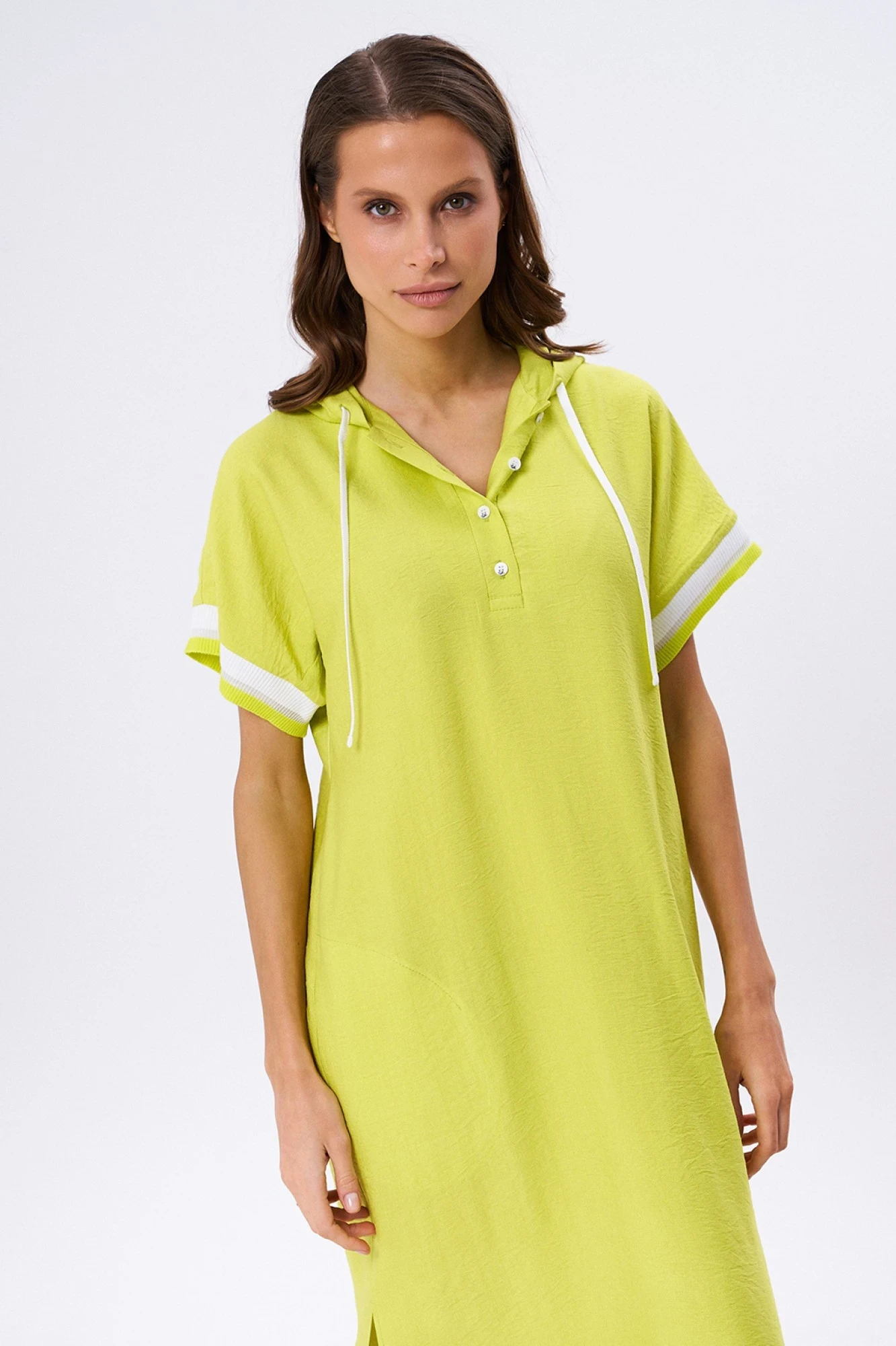 Свободное, прямое платье с капюшоном. Спущенный рукав отделан эластичным довязом в полоску. По переду застёжка в виде планки с пуговицами. В боковых швах карманы и разрезы.