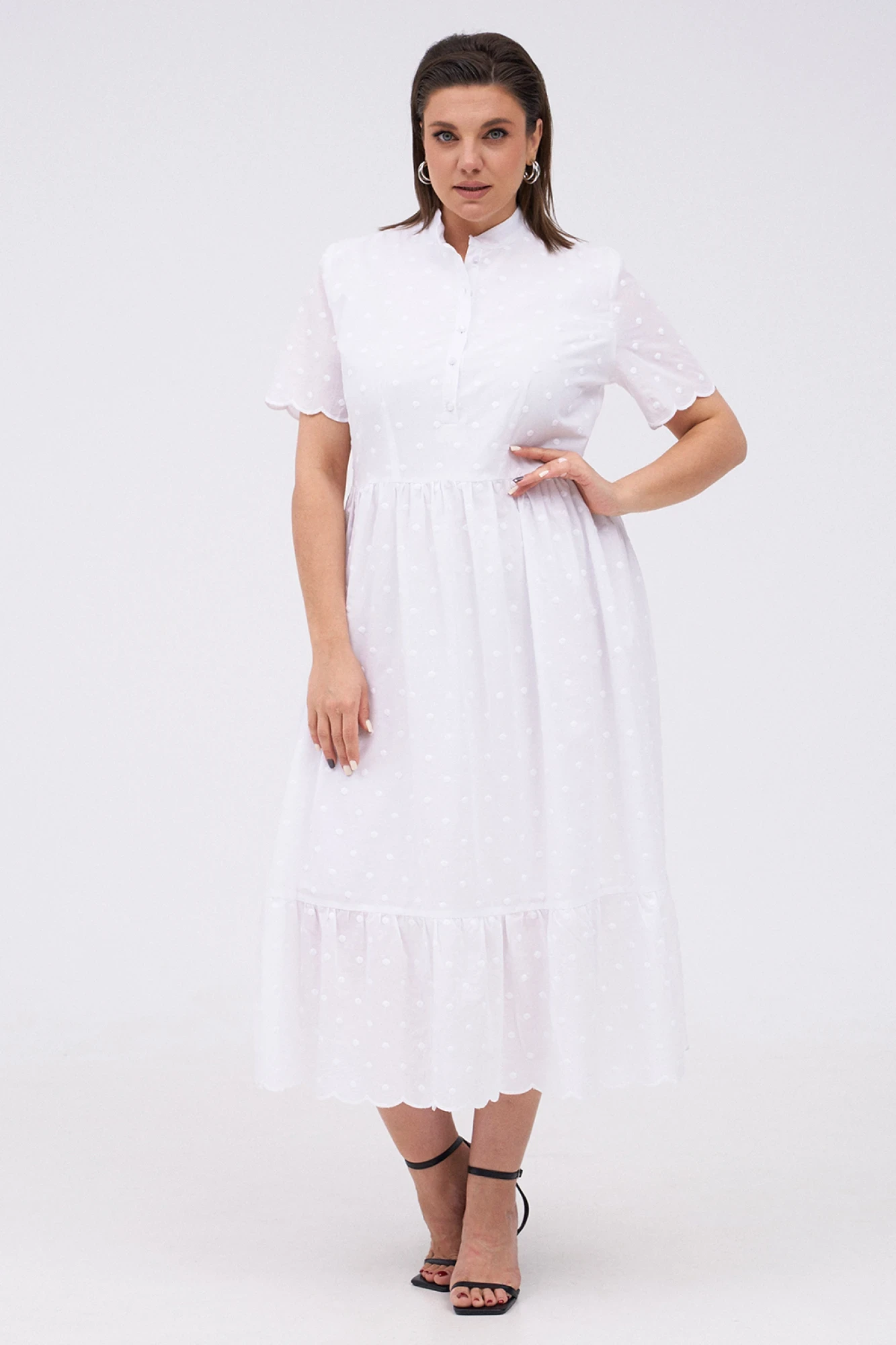 Платье женское свободного силуэта, отрезное по линии талии. Перед лифа с притачной планкой, которая застегивается на петли и пуговицы. Юбка платья имеет два яруса, которые собраны на сборку. Горловина обработана воротником – стойкой.