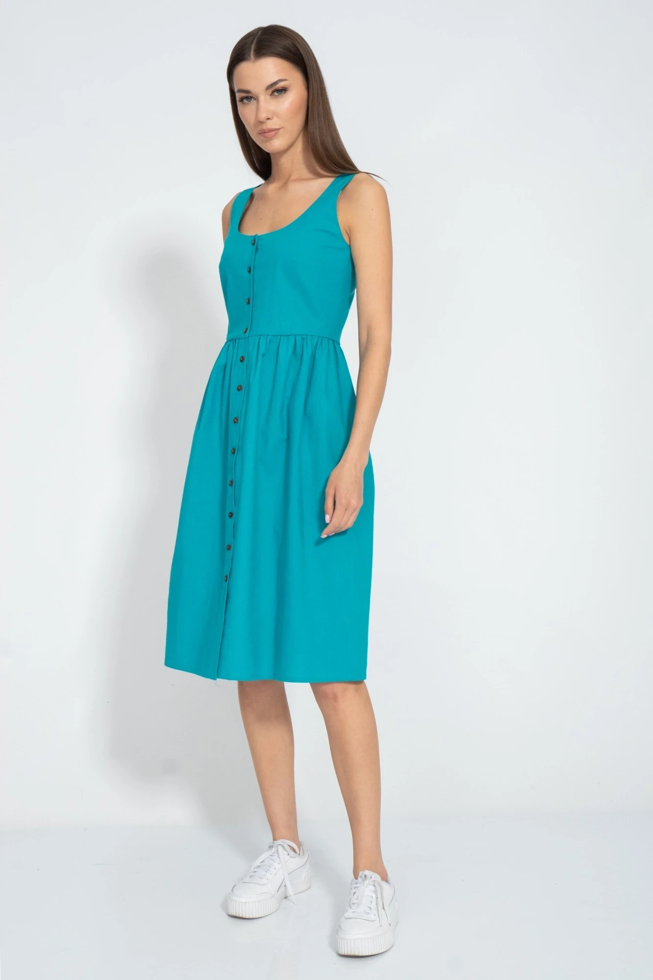 Платье с пуговицами по переду на бретелях из хлопка - это милое и нежное платье для летних прогулок. Это платье имеет приталенный крой, бретели и круглый вырез горловины. Платье застегивается на пуговицы по всей длине переда. Хлопок - это натуральная ткань, которая хорошо дышит, не мнется и приятна к телу. Платье с пуговицами по переду на бретелях можно носить с кедами, босоножками или туфлями, а также с разными украшениями и сумками
