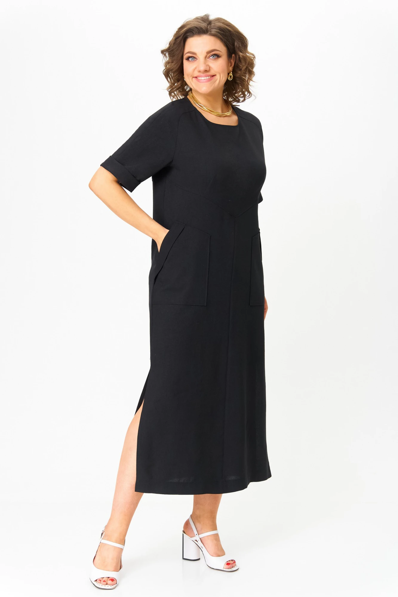 Летнее женское платье прямого силуэта. Полочка с фигурным подрезом чуть ниже груди. Нижняя часть полочки со средним швом. На уровне бедер накладные функциональные карманы с косым входом. В боковых швах снизу разрезы. Рукав короткий реглан с отворотной манжетой по низу. Спинка с подрезом и со средним швом. Платье без застежки. Платье без подкладки