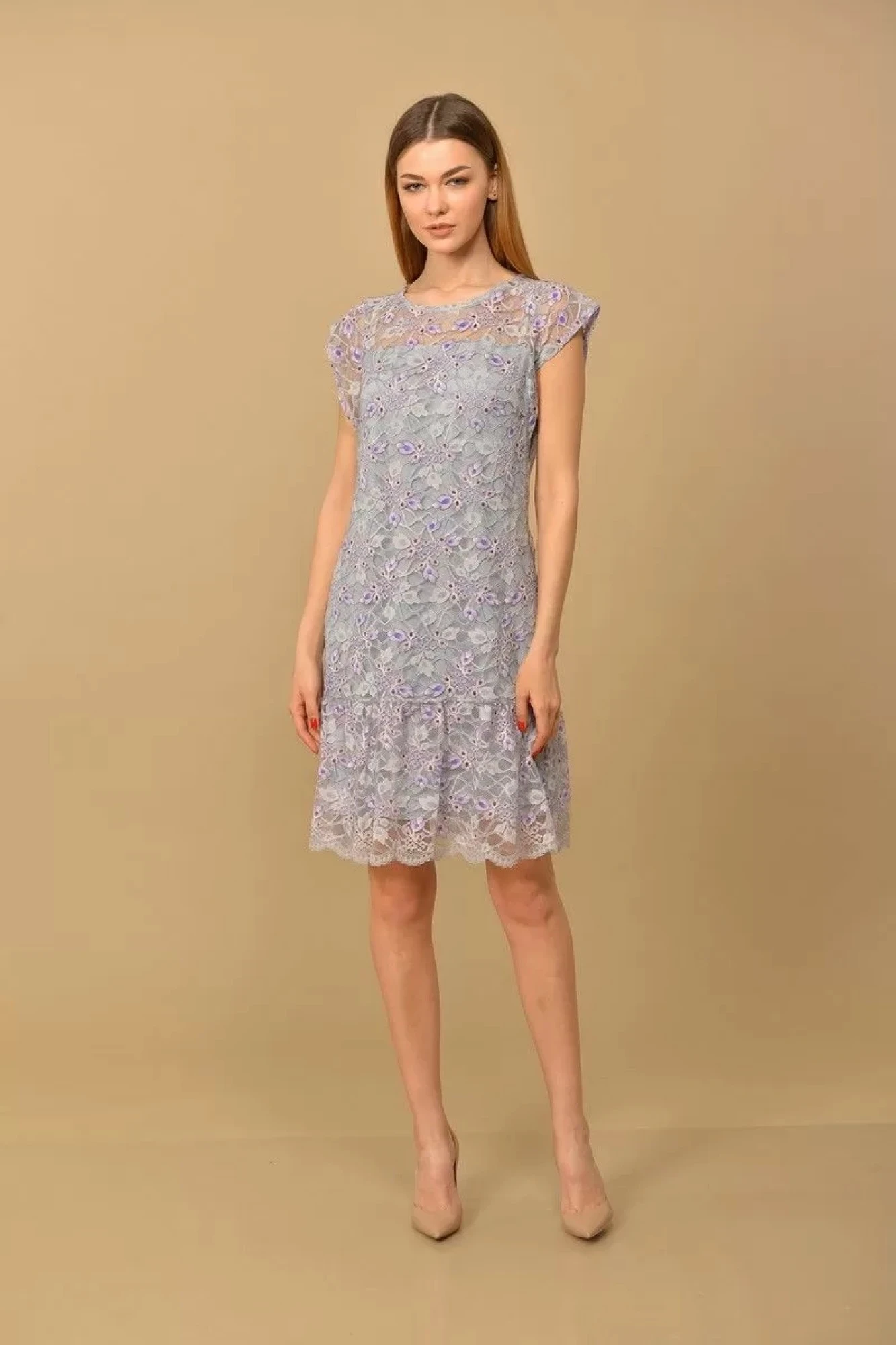 Платье женское, А - силуэта, из гипюра, на подкладке. С круглым вырезом горловины, с каплиевидным разрезом по спинке, застегивающимся на навесную петлю и пуговицу. Перед платья с нагрудными вытачками. Спинка цельная. Низ платья с притачной деталью из основного материала со сборкой вверху. Рукава "крылышки" со сборкой по окату.