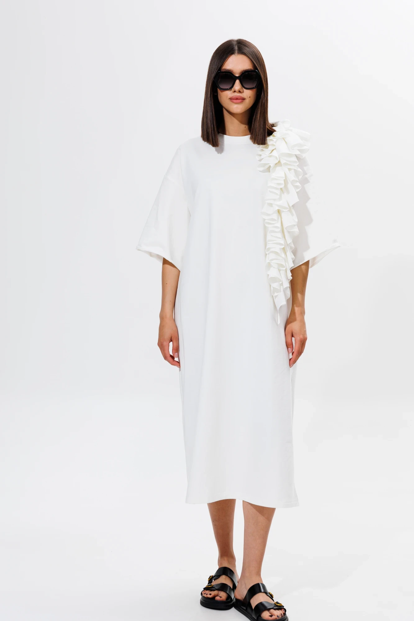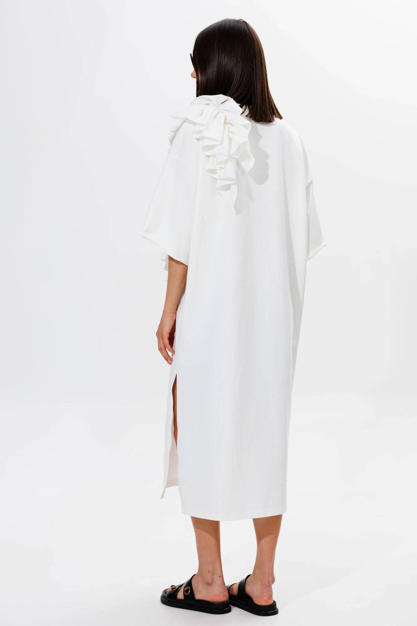 Платье прямого свободного силуэта (в стиле oversize) со спущенной линией плеча. Горловина округлой формы, обработана планкой-бейкой шириной 2,5 см. Длина спущенной линии плеча 23 см. Длина рукава 27 см. На детали полочки украшением платья (длина рюши 50 см) и спинки (длина рюши 27 см) расположена декоративная деталь: вертикальная ассиметричная рюша, шириной 20 см из воздушной отделочной ткани. В левом боковом шве платья расположен открытый разрез, высота разреза 42 см.