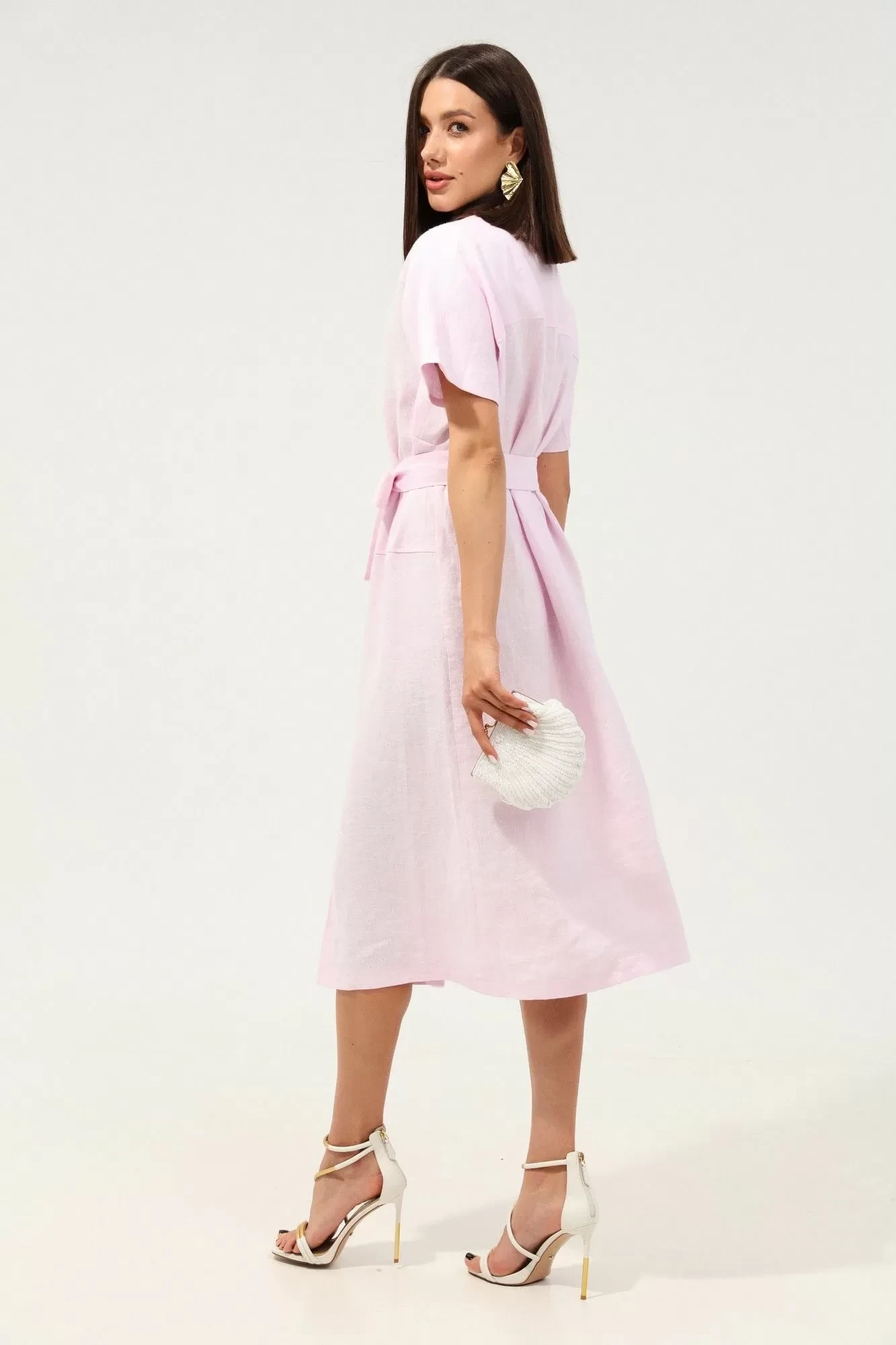 Платье в стиле casual предназначено для повседневной носки, прекрасно сочетается с любой по стилю обувью. Платье прямого силуэта, длиной ниже колена, со спущенной линией плеча и рукавами на основе цельнокроеного. Спинка и перед с горизонтальной кокеткой. Застежка спереди на планку и петли-пуговицы. Воротник рубашечный на стойке. По линии бёдер диагональный подрез. По переду нижней части платья глубокая складка. Пояс в комплекте.