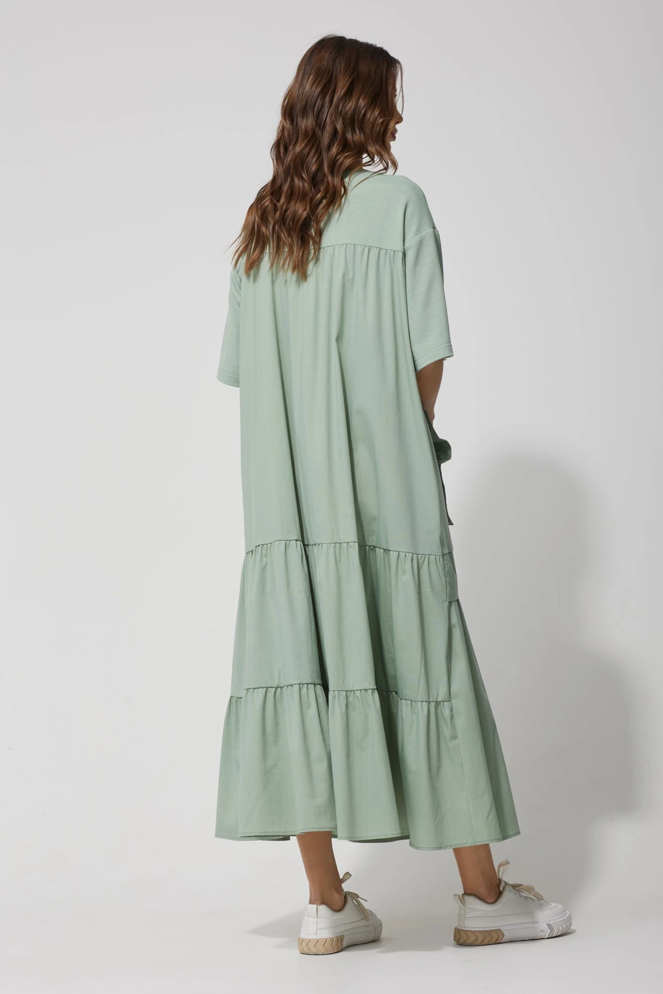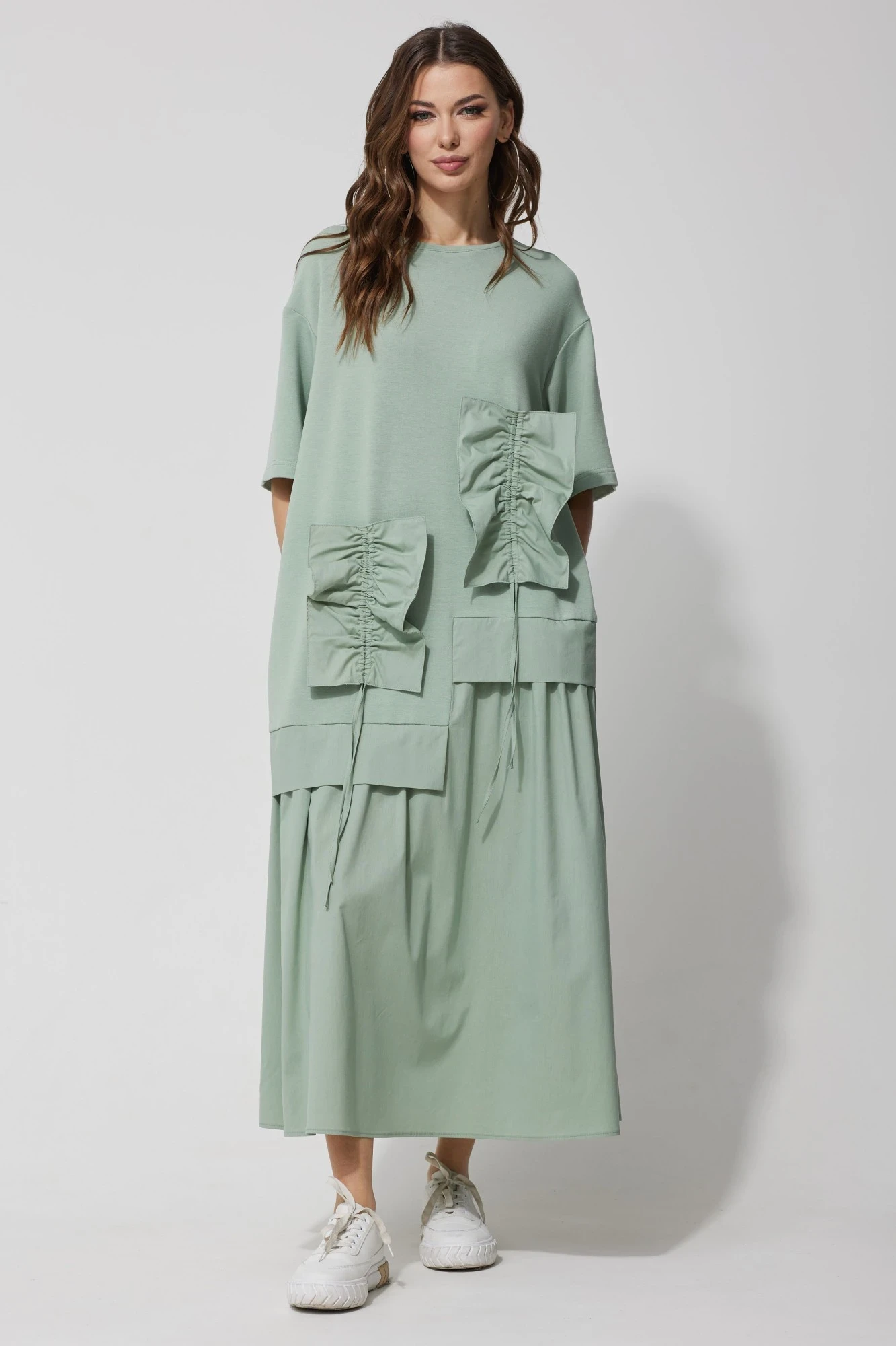 Женское комфортное платье силуэта трапеция из трикотажа комбинированное поплином. Горловина округлая. Рукав со спущенной линией плеча длиной до локтя. В нижней части переда волан со сборкой и фигурным подрезом, а также декоративные элементы. На спинке подрезы со сборкой из поплина. В боковых швах функциональные карманы.