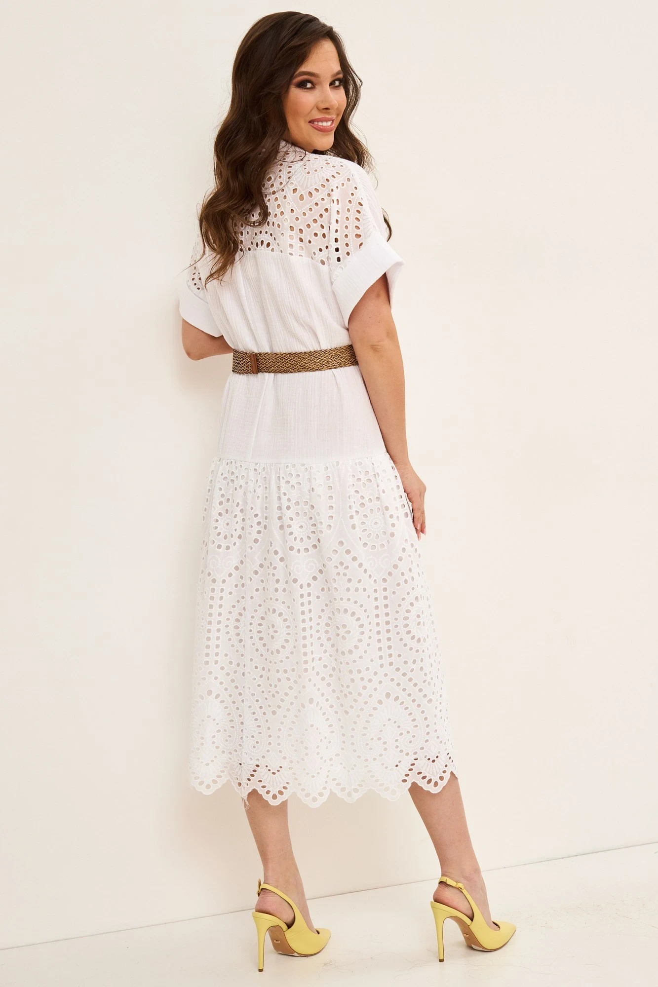 Легкое хлопковое платье полуприлегающего силуэта. Рукав цельнокроеный. Платье с центральной застежкой на пришивные пуговицы. Дополнено отложным воротником. Верх платья выполнен из нежнейшего хлопкового полотна (муслин). Низ платья на хлопковой подкладке, выполнен из хлопка решелье. Платье дополнено съемными поясом. Длина платья от плечевого шва 123см. Длина рукава 25см.