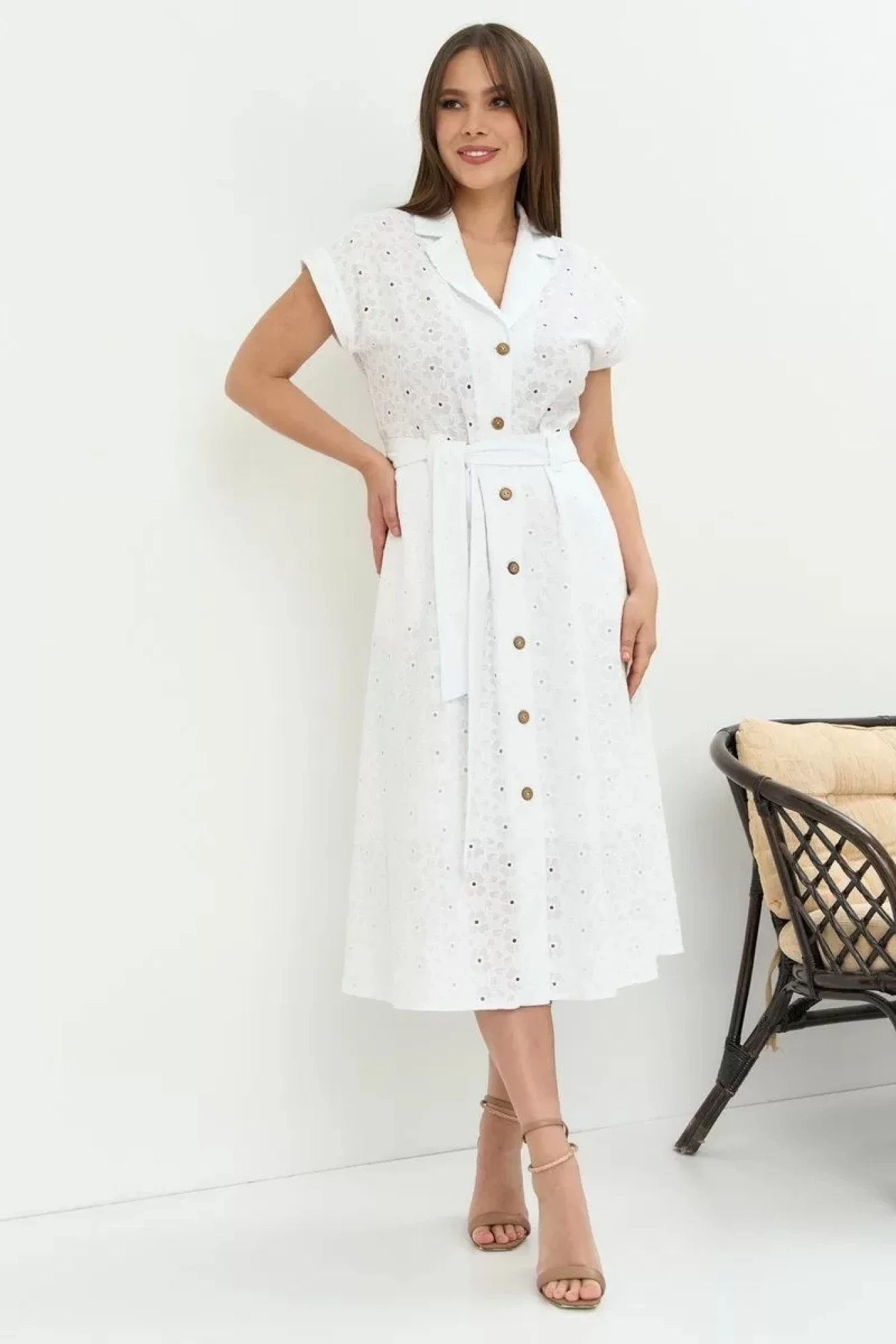 Легкое воздушное платье свободного кроя. Выполнено из натурального хлопкового полотна с вышивкой. Центральная застежка на пришивные пуговицы. Воротник отложной. Рукав цельнокроеный. Платье по талии отрезное. Нижняя часть на подкладке из хлопка. Приталено за счет съемного пояса, выполненного из основной ткани.