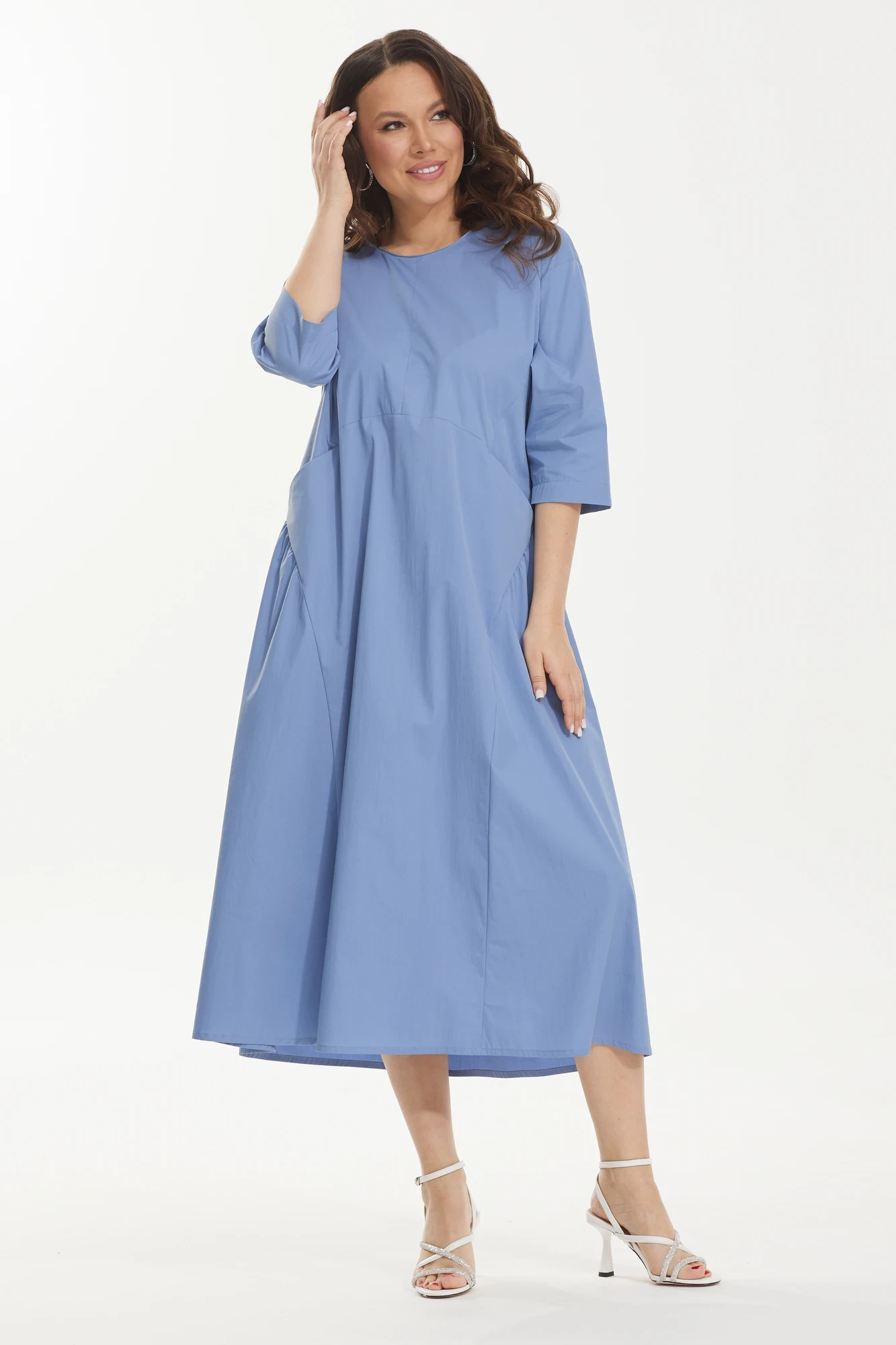 Стильное платье свободного кроя со слегка завышенной фигурной линией талии по переду. Рукав втачной, длиной ниже локтя. По спинке застежка на потайную молнию. Платье дополнено функциональными боковыми карманами. Длина платья от плечевого шва 126 см. Длина рукава 38см.
