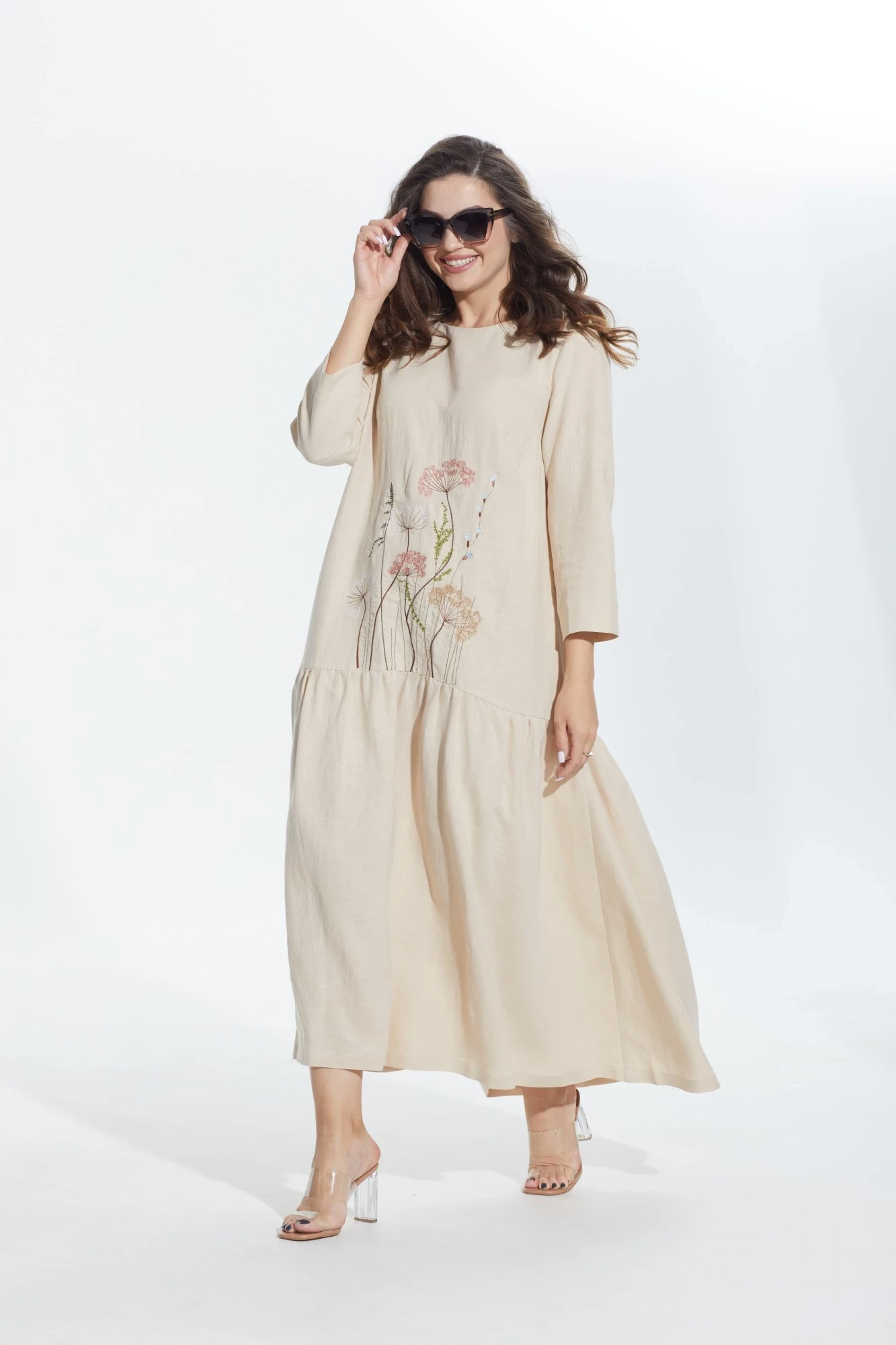 Платье в стиле оверсайз. Горловина округлой формы, слегка расширена. Платье с подрезом ниже линии бедер, нижняя часть со сборкой по кругу. Перед с нагрудными вытачками от боковых швов и вышивкой от подреза. В боковых швах карманы. Верхняя часть спинки со средним швом, вверху которого разрез, застегивающийся на 2 навесные петли и пуговицы. Рукав втачной одношовный, длиной 3/4