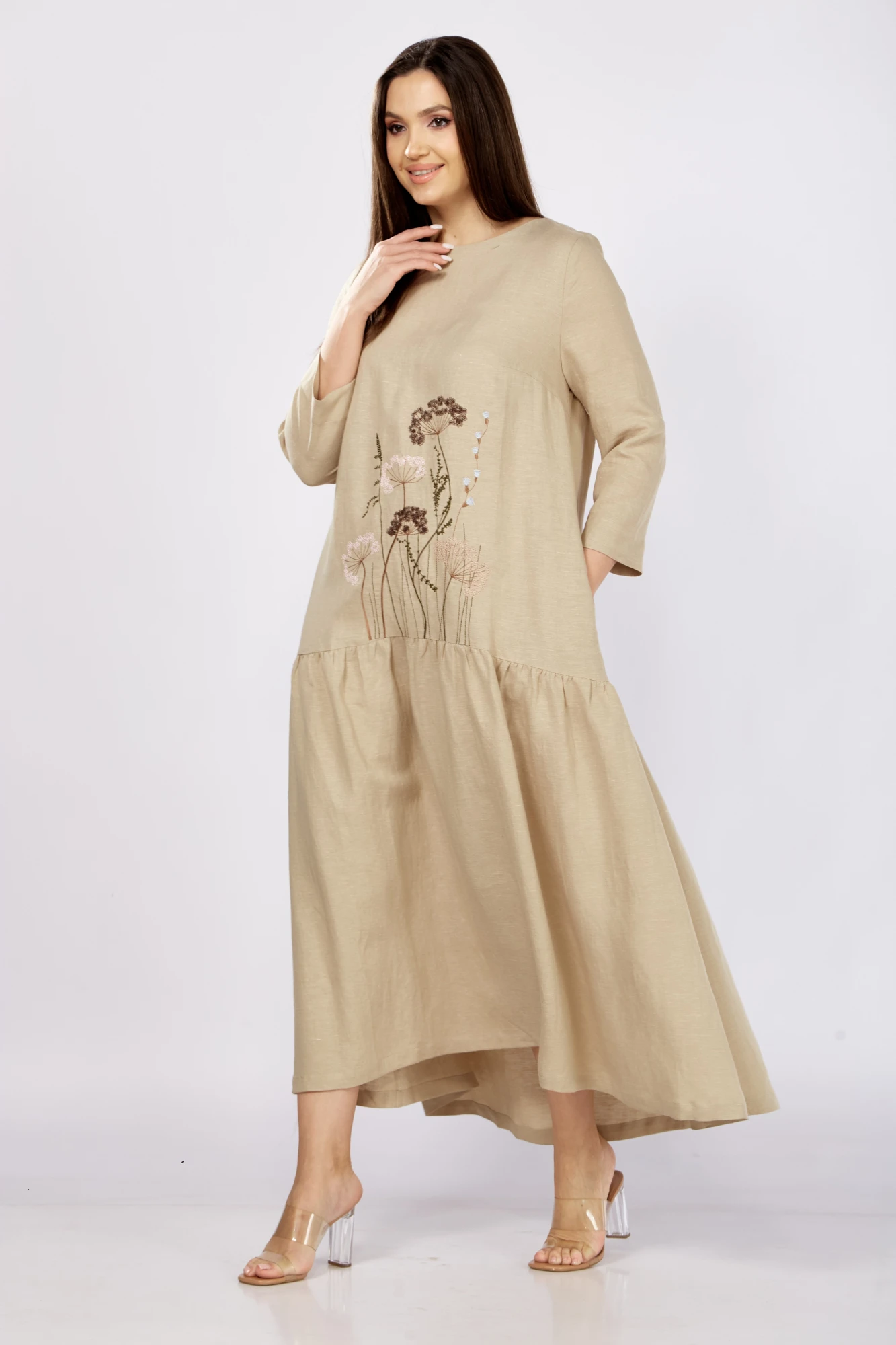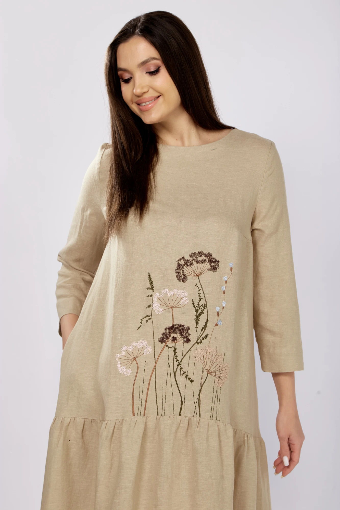 Платье в стиле оверсайз. Горловина округлой формы, слегка расширена. Платье с подрезом ниже линии бедер, нижняя часть со сборкой по кругу. Перед с нагрудными вытачками от боковых швов и вышивкой от подреза. В боковых швах карманы. Верхняя часть спинки со средним швом, вверху которого разрез, застегивающийся на 2 навесные петли и пуговицы. Рукав втачной одношовный, длиной 3/4