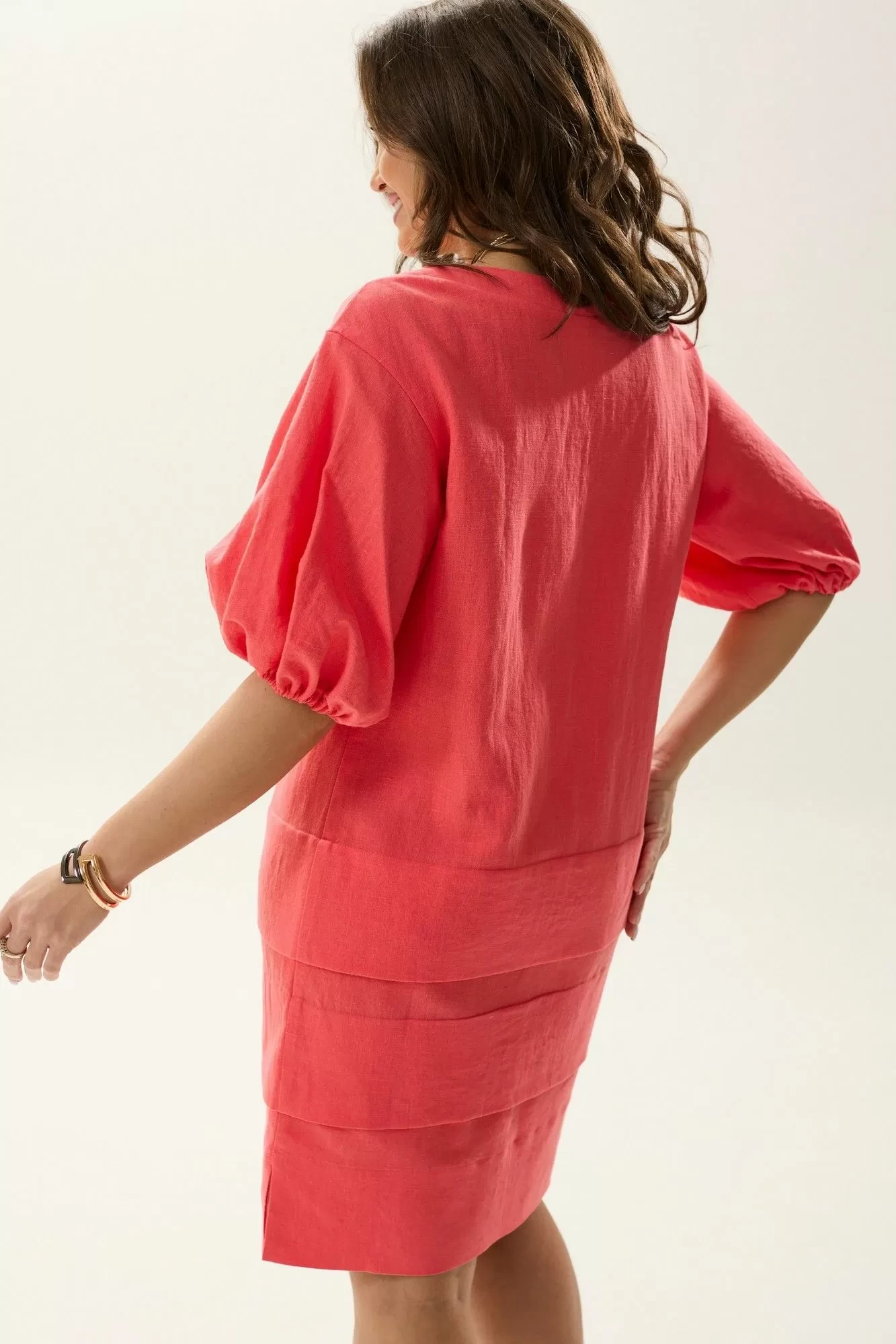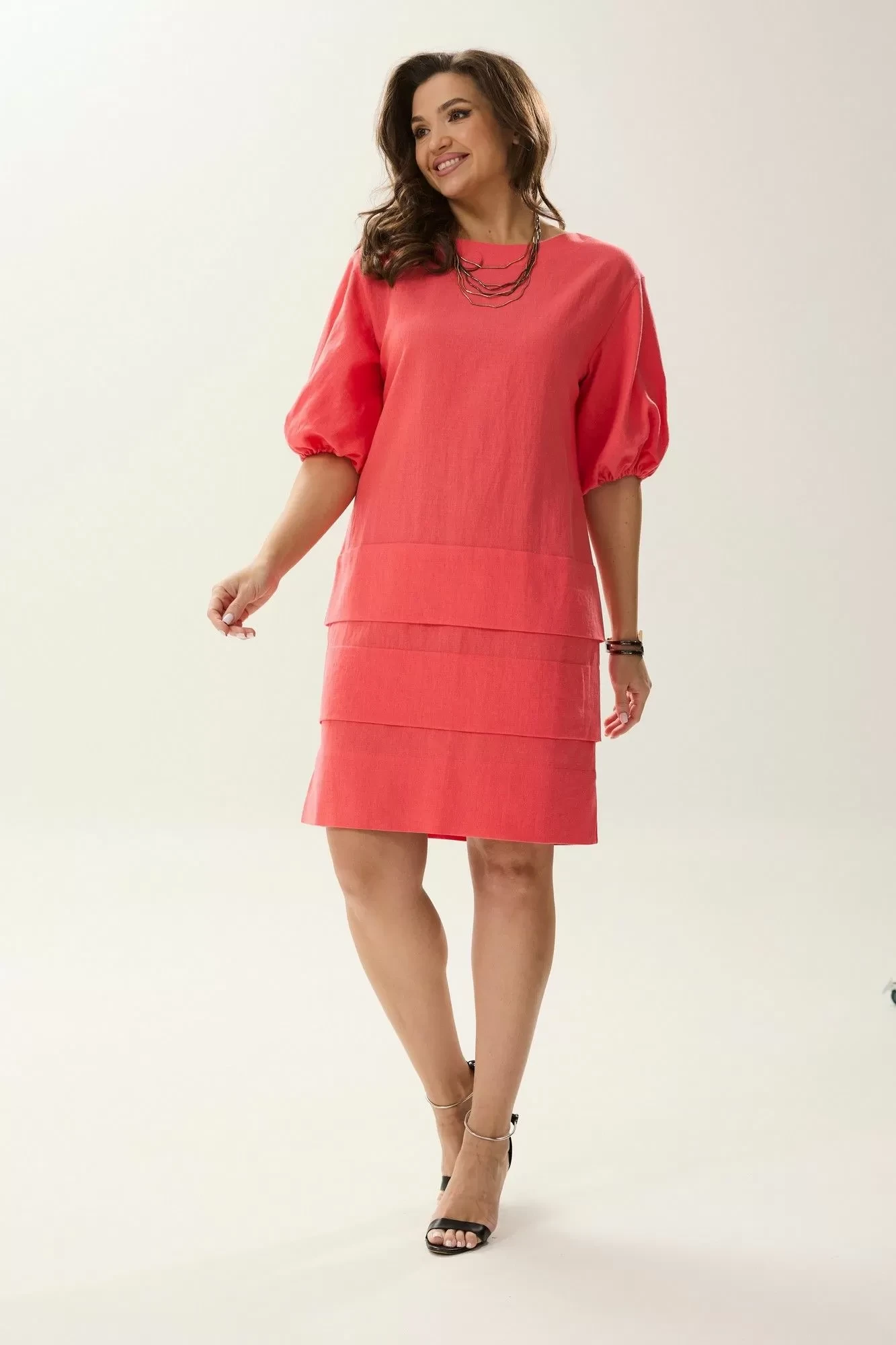 Платье прямого силуэта с крупными декоративными складками по низу юбки. В боковых швах по низу небольшие разрезы. Горловина в форме лодочки, плечо спущенное. Рукав ¾, расширенный книзу, собранный на резинку.