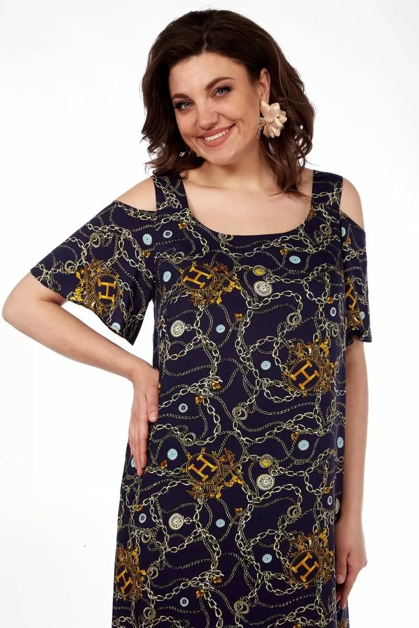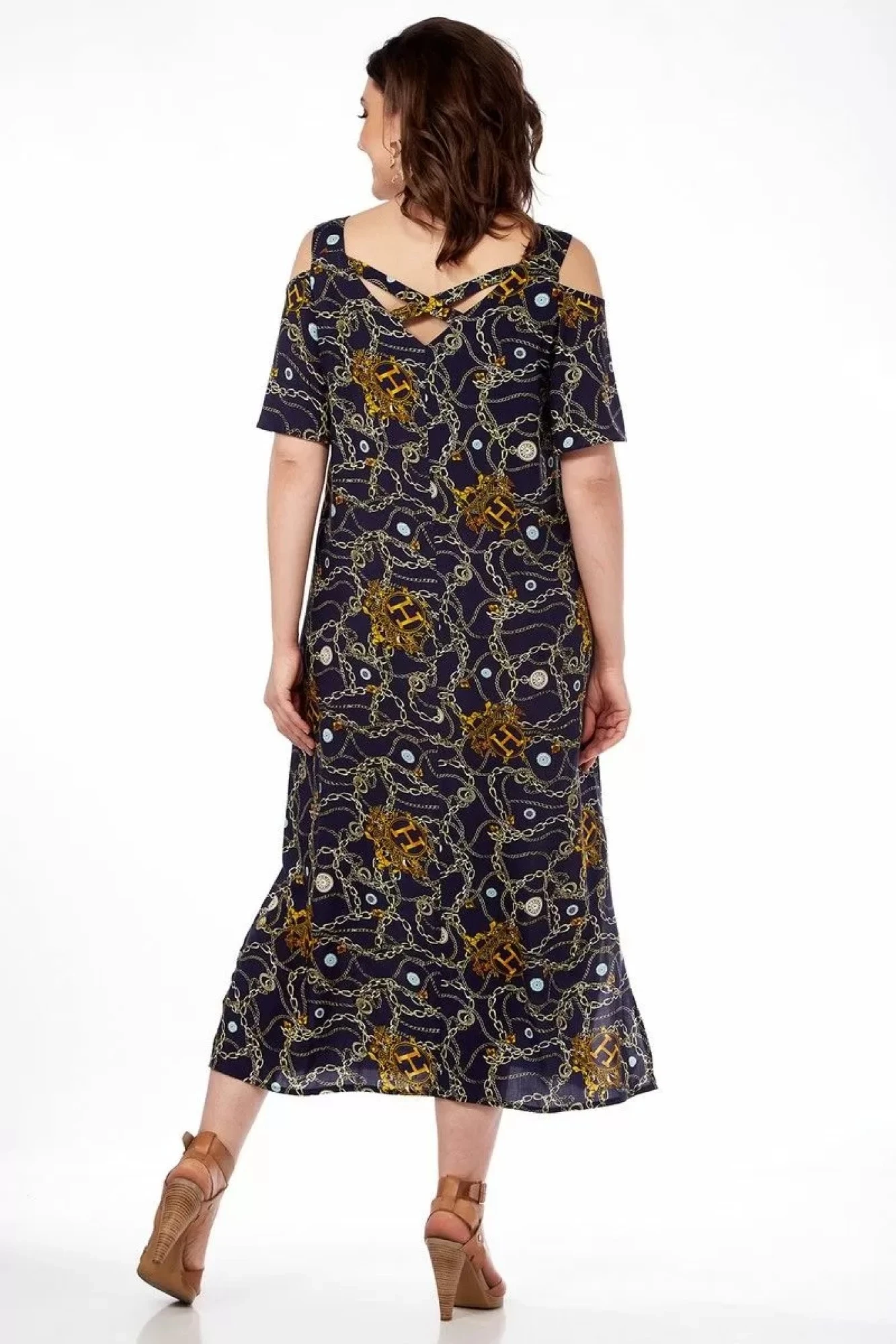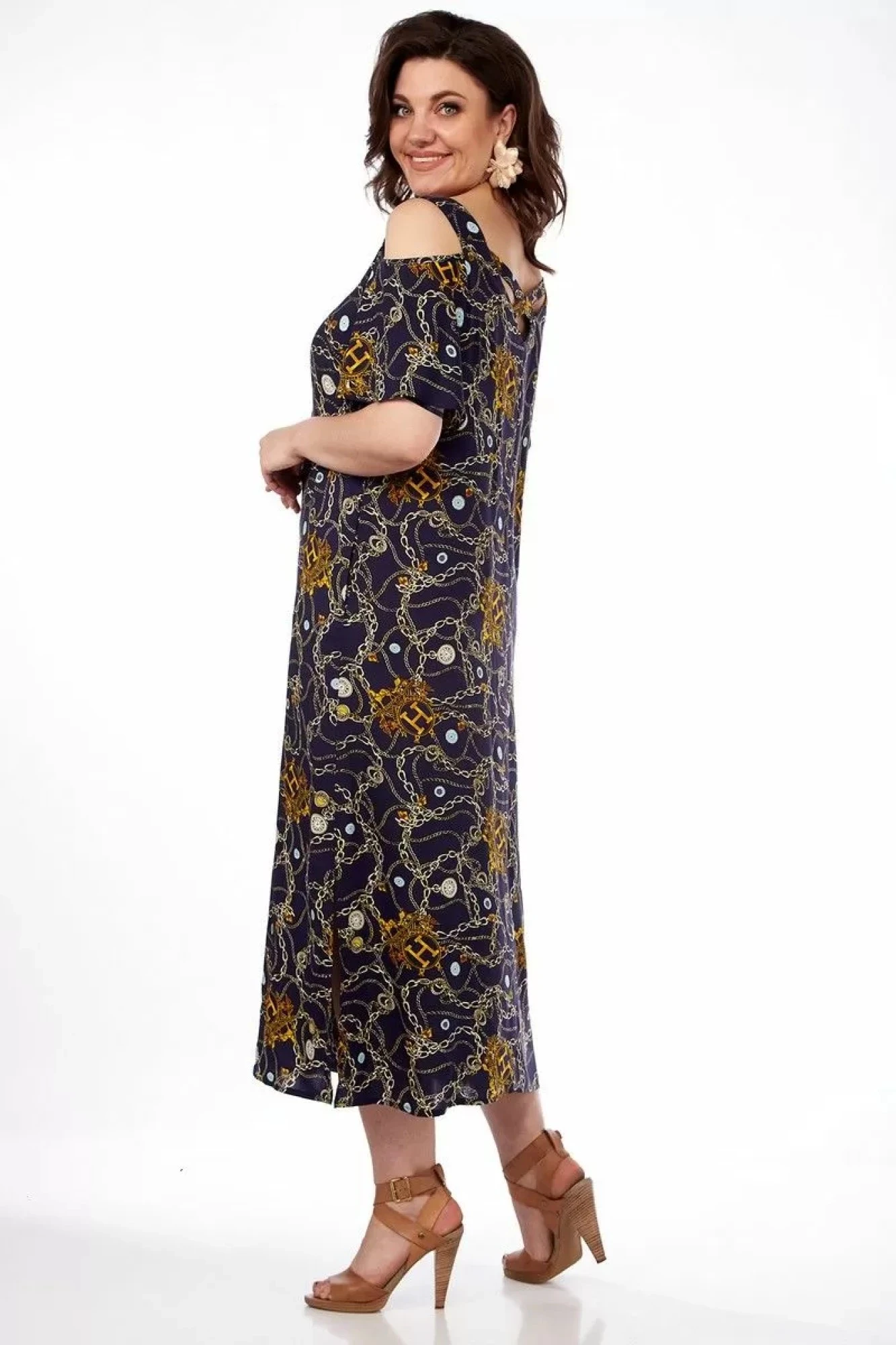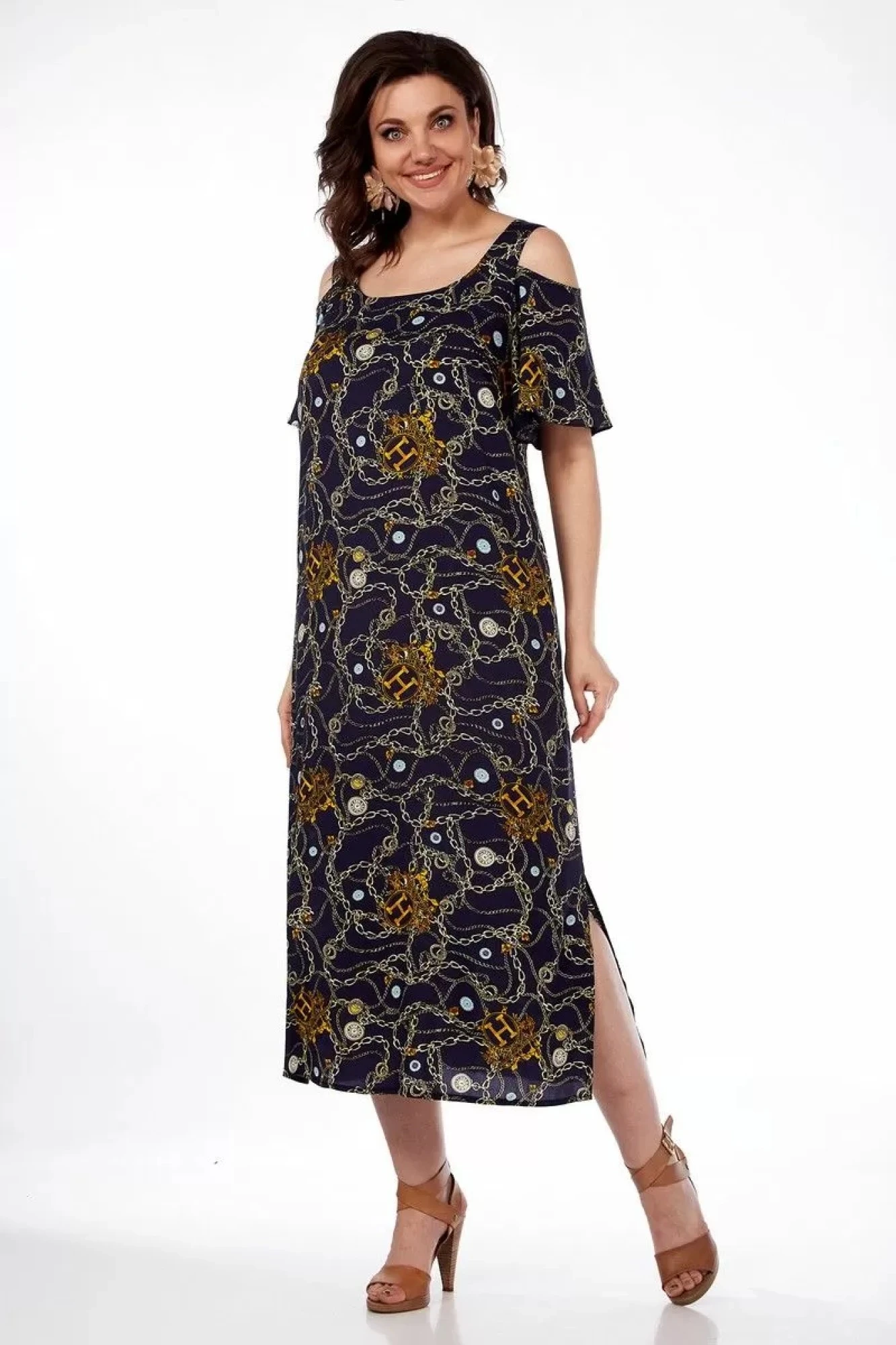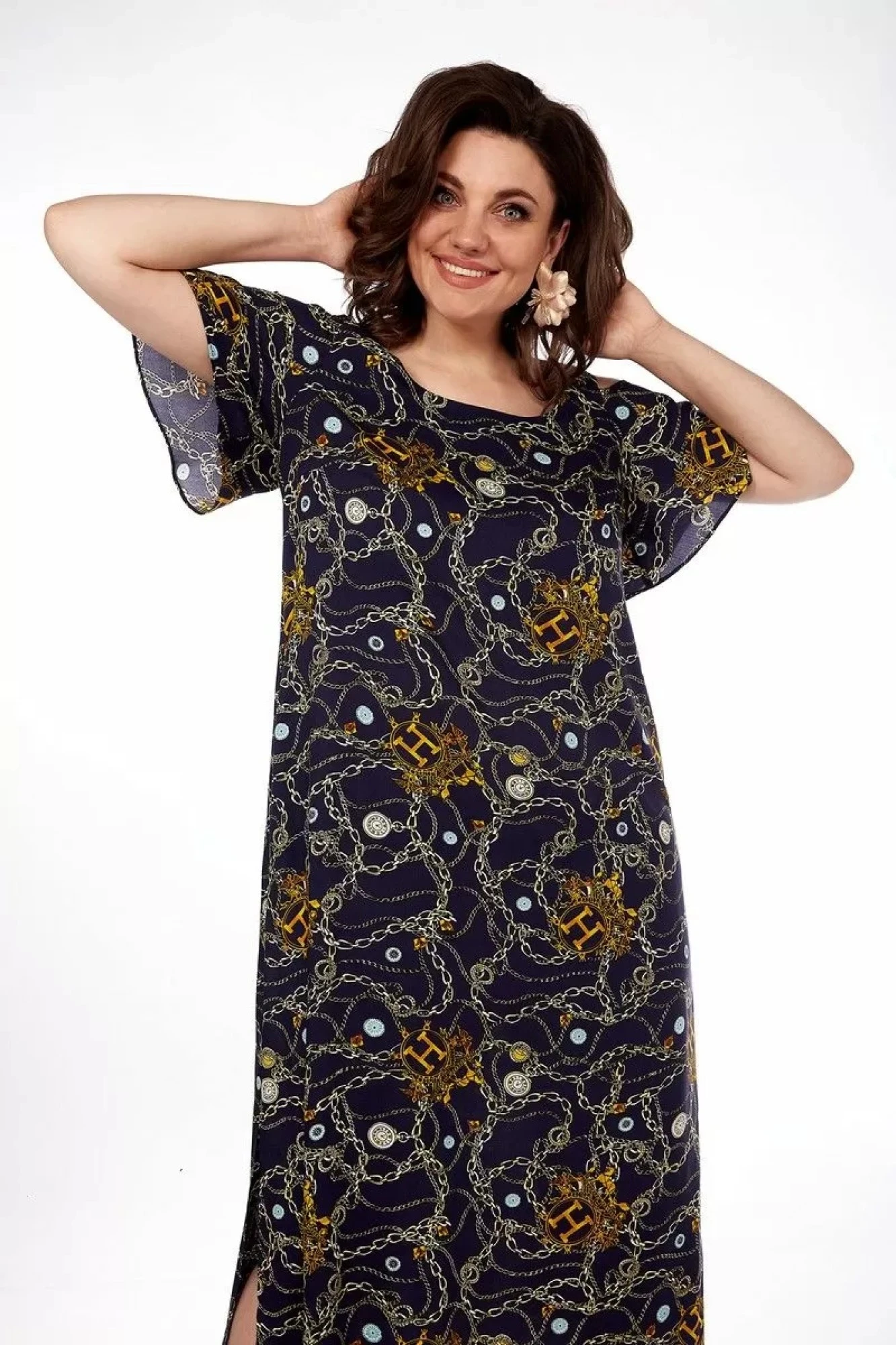 Платье женское свободного покроя из вискозы. По переду вырез горловины круглый,по спинке V-образный с перемычками. В боковых швах выполнены карманы. Платье на бретелях с крылышками.