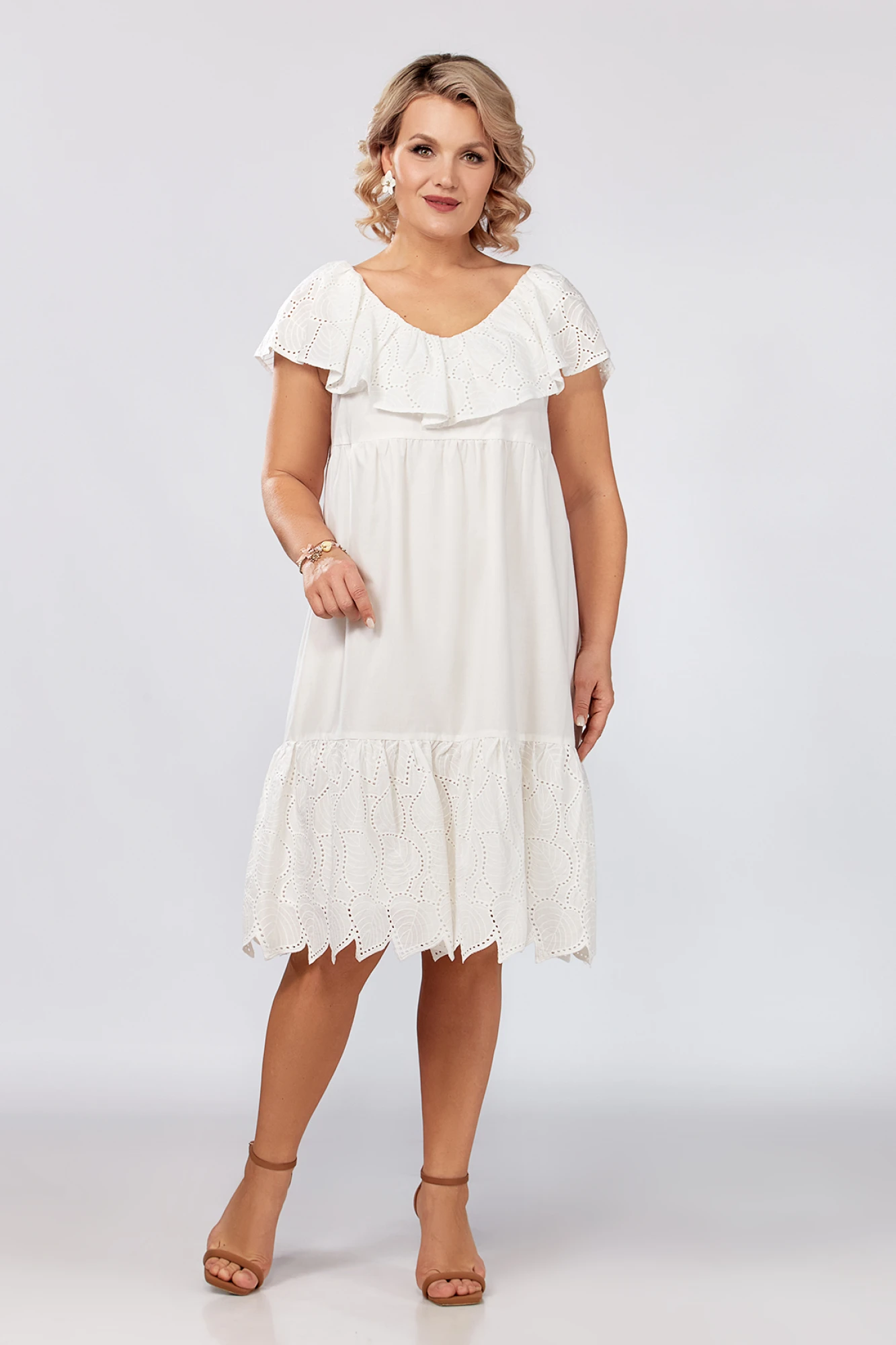 Летнее платье свободного покроя, выполнено из хлопковой ткани и хлопка с вышивкой. Горловина платья округлой формы, обработана притачным воланом, присборенным по горловине, из хлопковой ткани с вышивкой. Также на полочке обработана кокетка из однотонного хлопка, нижний волан присборен и выполнен из хлопка с вышивкой. Спинка выполнена из однотонного хлопка, со средним швом и вытачками, в среднем шве потайная молния. Легкое, эффектное платье на хлопковой подкладке отличный вариант для вашего летнего гардероба!