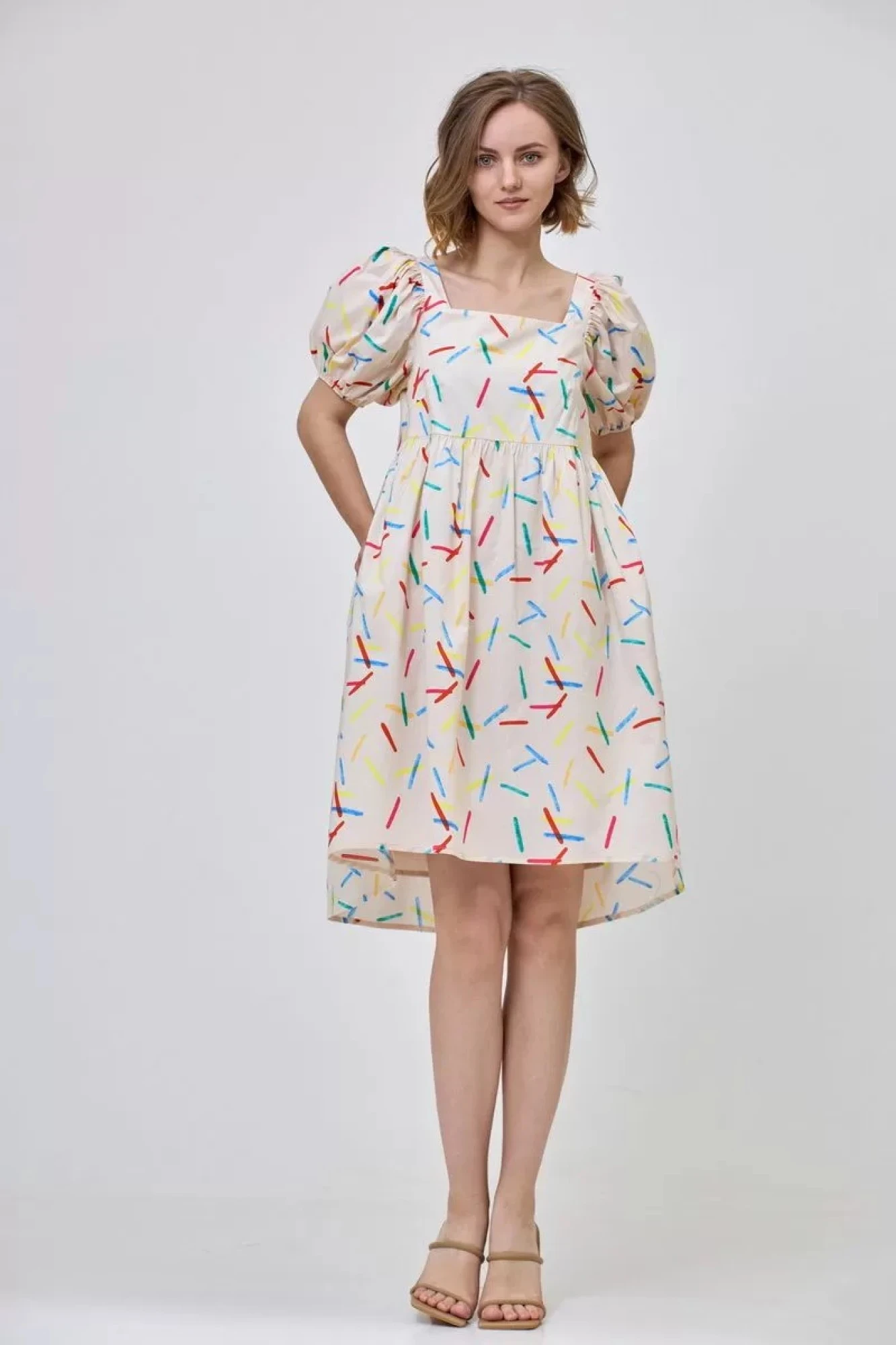 Платье с пышной юбкой свободного силуэта на подкладке, выполнено из ткани с принтом в разноцветные конфетти.