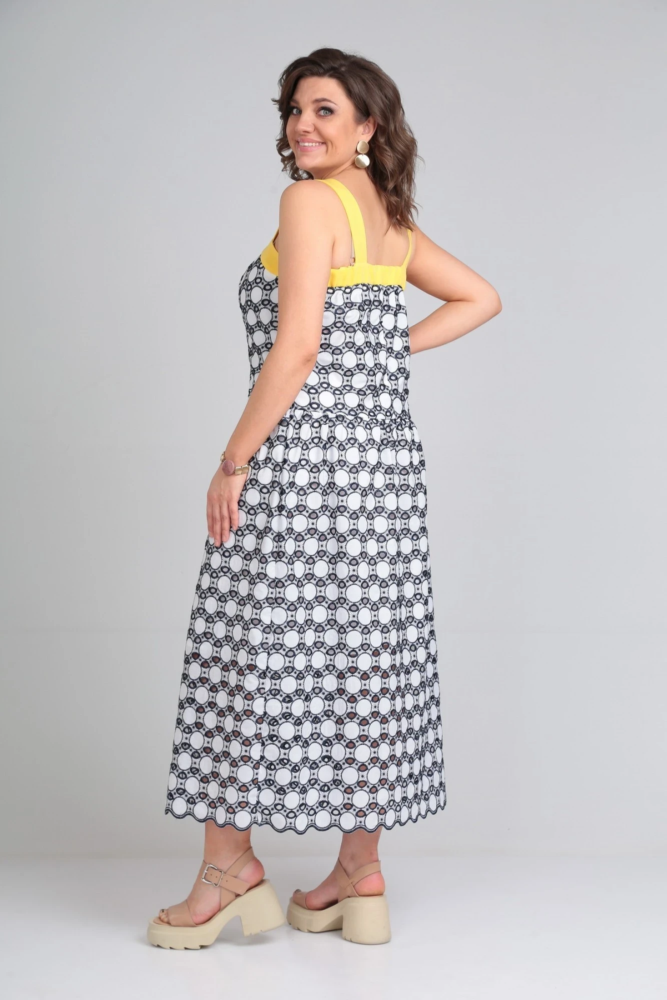 Платье-сарафан из хлопка «шитье» (не тянется) полуприлегающего силуэта на бретелях из контрастной отделочной ткани. Сарафан на хлопковой подкладке. Сарафан отрезной чуть ниже линии талии. Низ присборен по шву притачивания. По лифу переда рельефные швы и притачная планка из отделочной контрастной ткани желтого цвета. По лифу спинки средний шов и притачная планка из отделочной контрастной ткани, присборенной с помощью резинки.