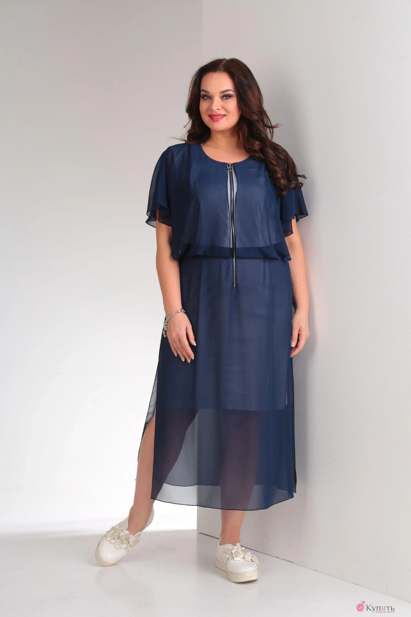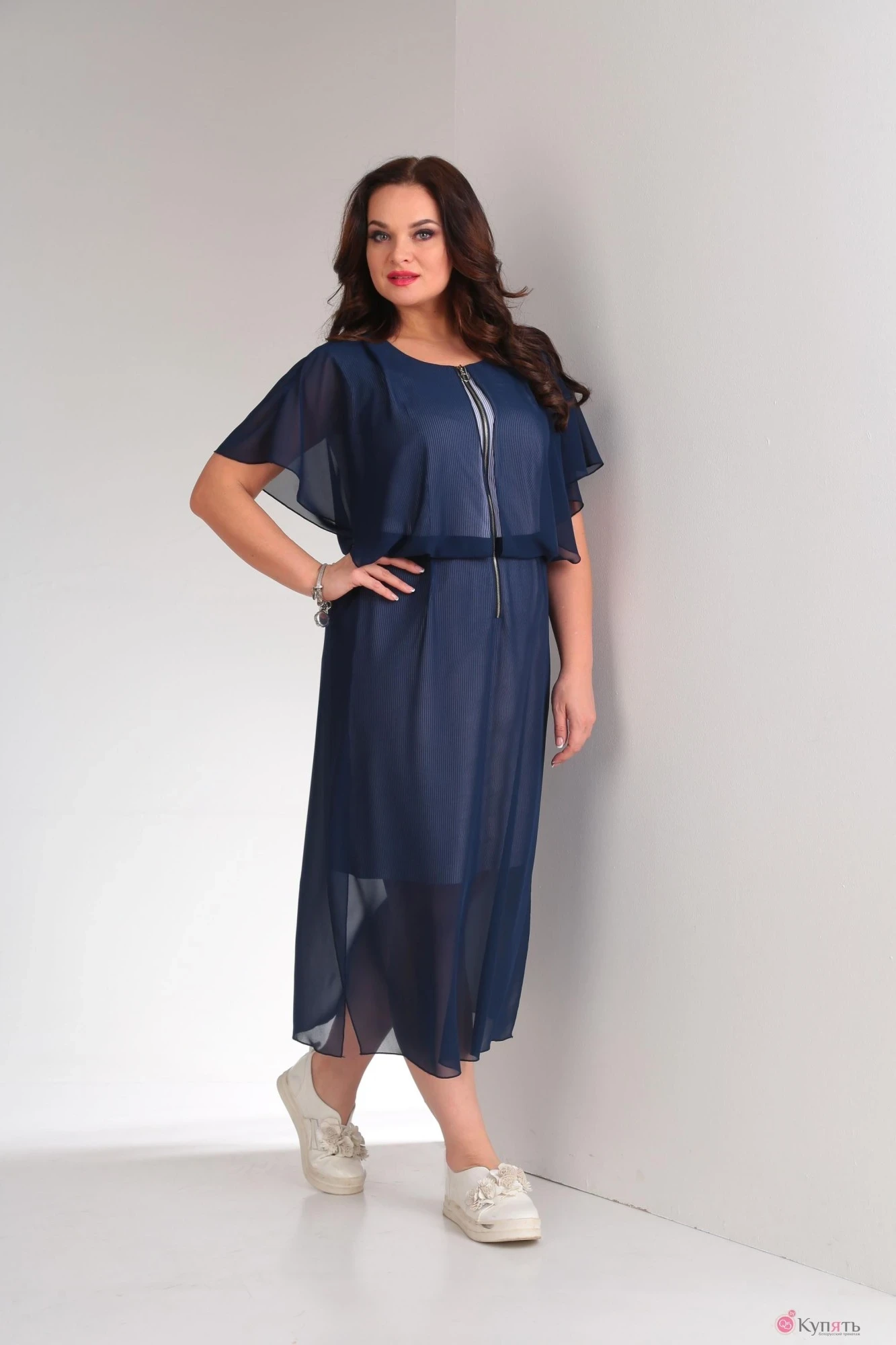 Платье выполнено из ткани в бело-синюю полоску (ПЭ 63%, вискоза 33%, ПУ 4%), а сверху темно-синий шифон (ПЭ 100%). По переду платья есть функциональная застежка на молнии длиной 50 см. Платье отрезное по линии талии. Верхняя часть выполнена с напуском и в форме сферы, что позволяет прикрыть руку до уровня локтя. Шифоновая юбка по бокам не стачная,что придает наряду легкость и современность.