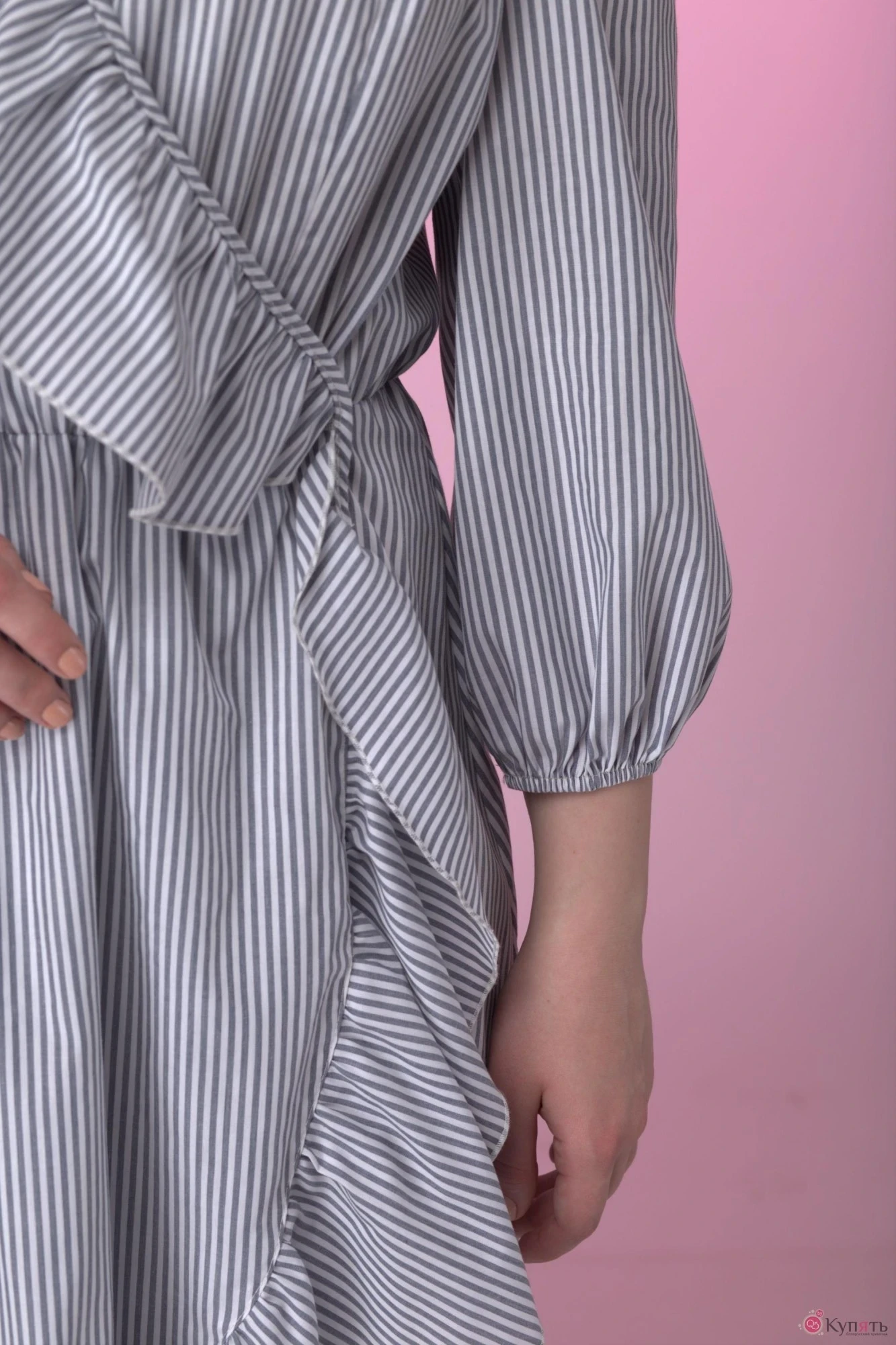 Категория: платье Платье полуприлегающего силуэта, отрезное по линии талии на резинке. V образный вырез. Платье « на запах».Втачной Рукав ¾ на резинке.