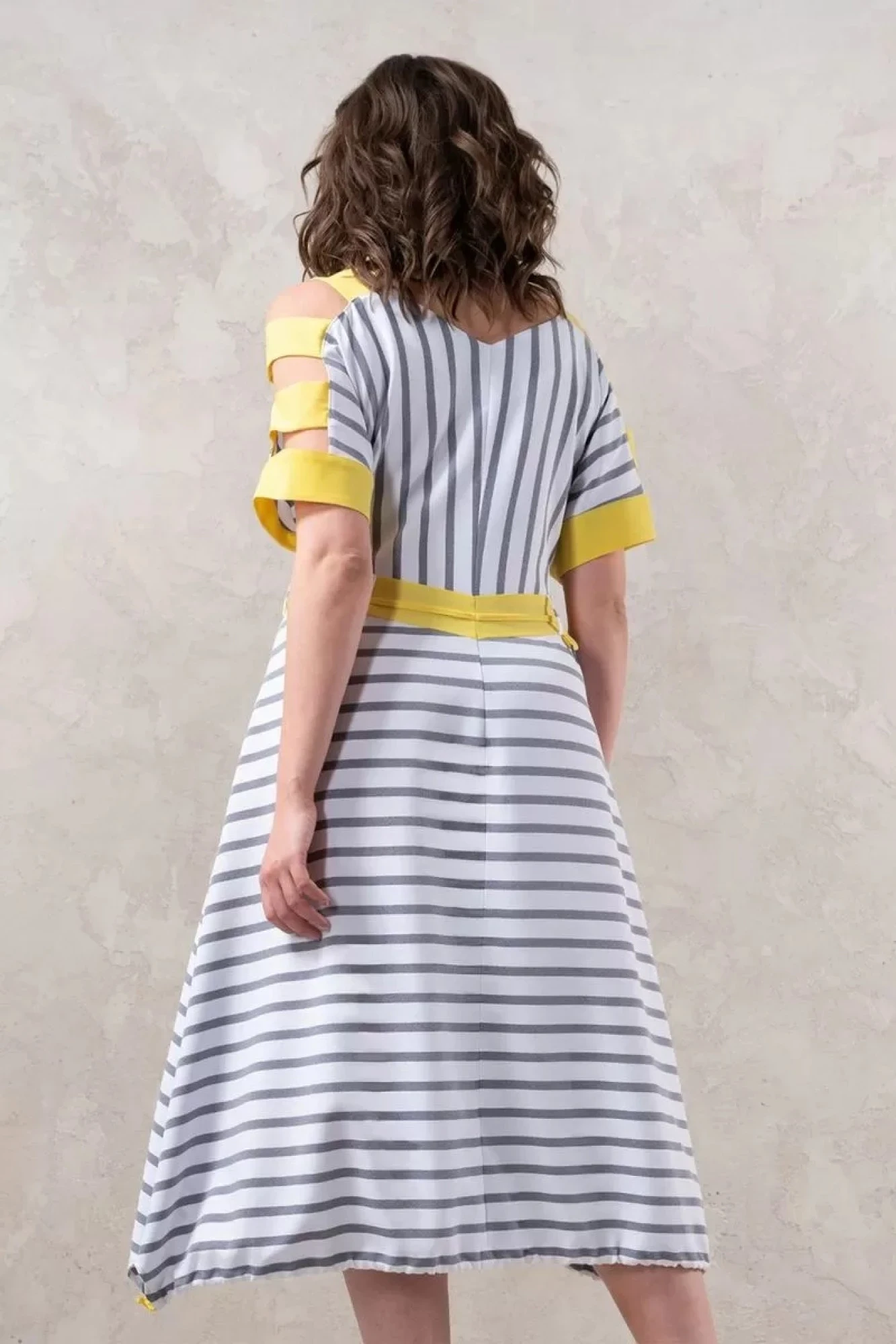Летнее платье полуприлегающего силуэта из костюмно-плательной ткани. На переде удобные карманы, низ асимметричен по модели. На спинке небольшое декольте. Рукав цельнокроеный. Длина изделия в 50-52-54 размерах 103 см, в 56-58-60 размерах 105 см, измерялась от выреза горловины.