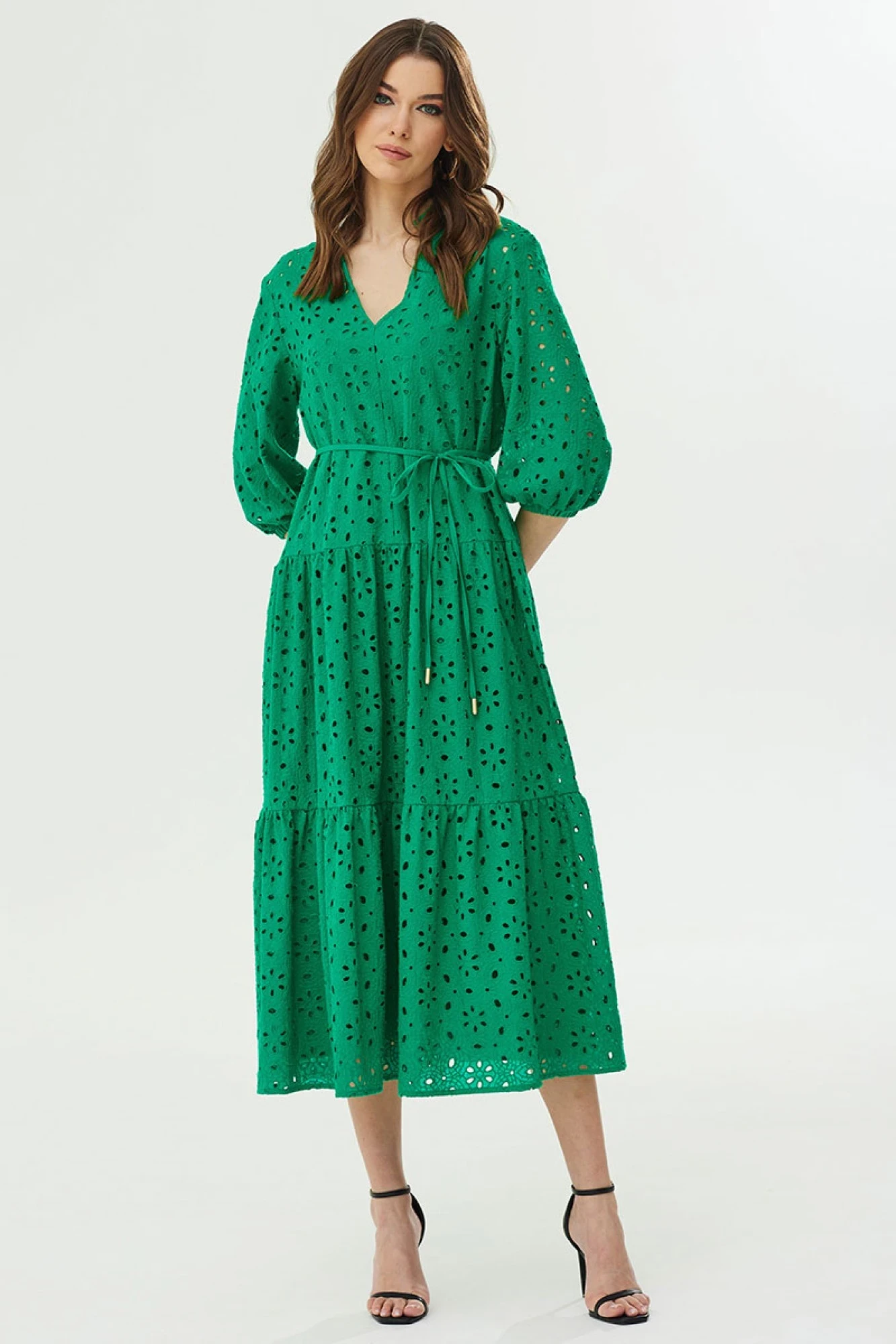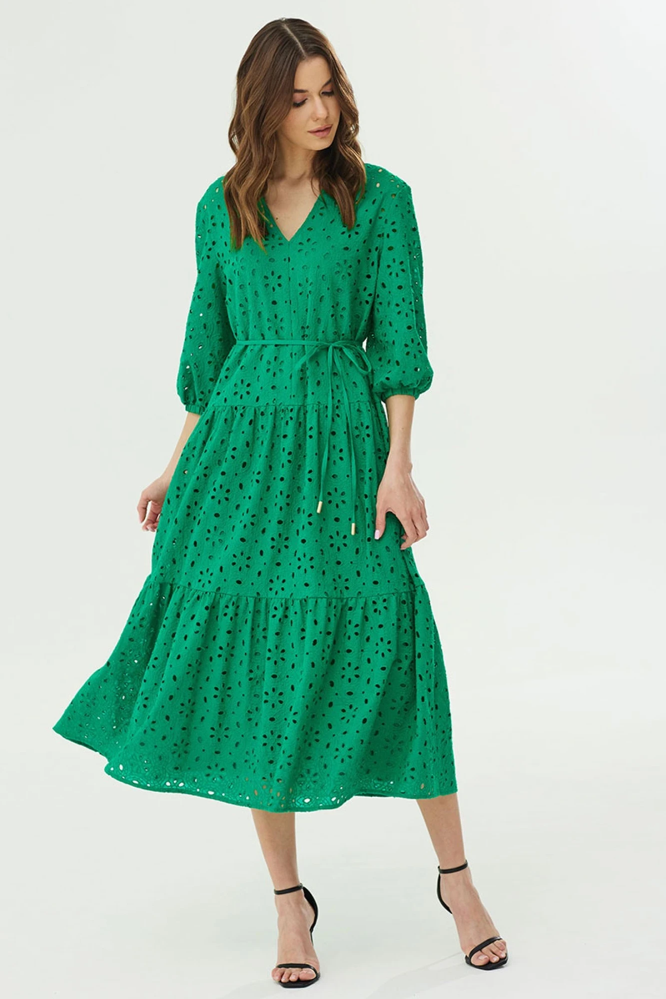 Нарядное платье свободного силуэта из ришелье. V-образная горловина. Рукав втачной по низу на резинке. По переду и спинке горизонтальные подрезы с воланами на сборке. В комплект входит платье-комбинация из хлопковой ткани. В комплект входит съемный пояс-шнурок.
