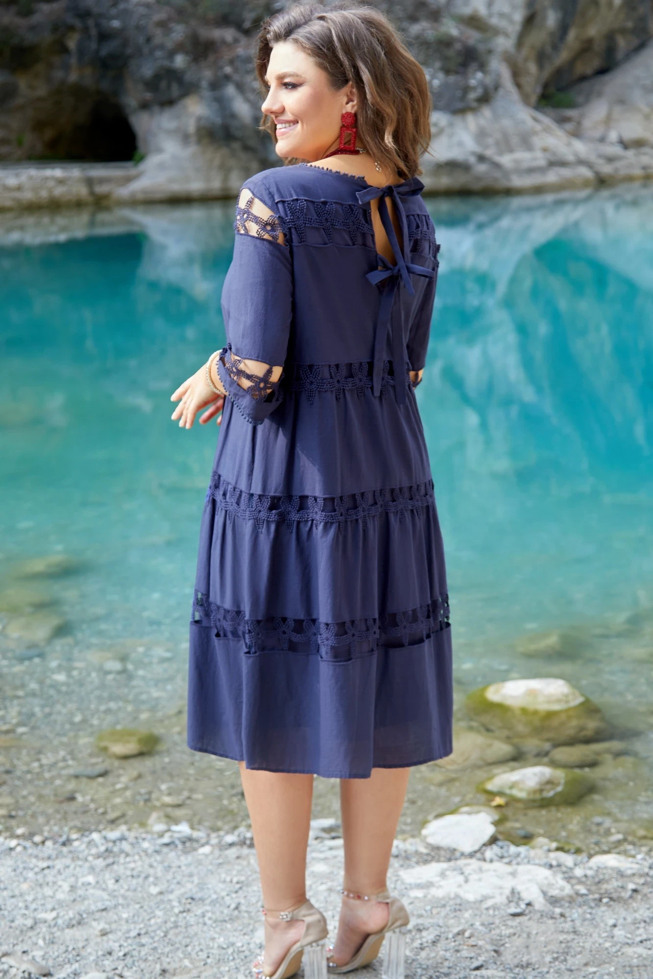 Никаких сомнений – это хитовая модель точно станет яркой ноткой вашего летнего гардероба! Свободный силуэт и оригинальная вышивка на хлопке создают нежный образ. Платье А – образного силуэта на подкладке. По переду расположены нагрудные вытачки, горизонтальные подрезы со вставками из хлопокового гипюра, вырез горловины округлой формы с кружевной тесьмой. Спинка с горизонтальными подрезами, на горловине вырез с завязками. Рукав втачной, по низу притачано кружево.