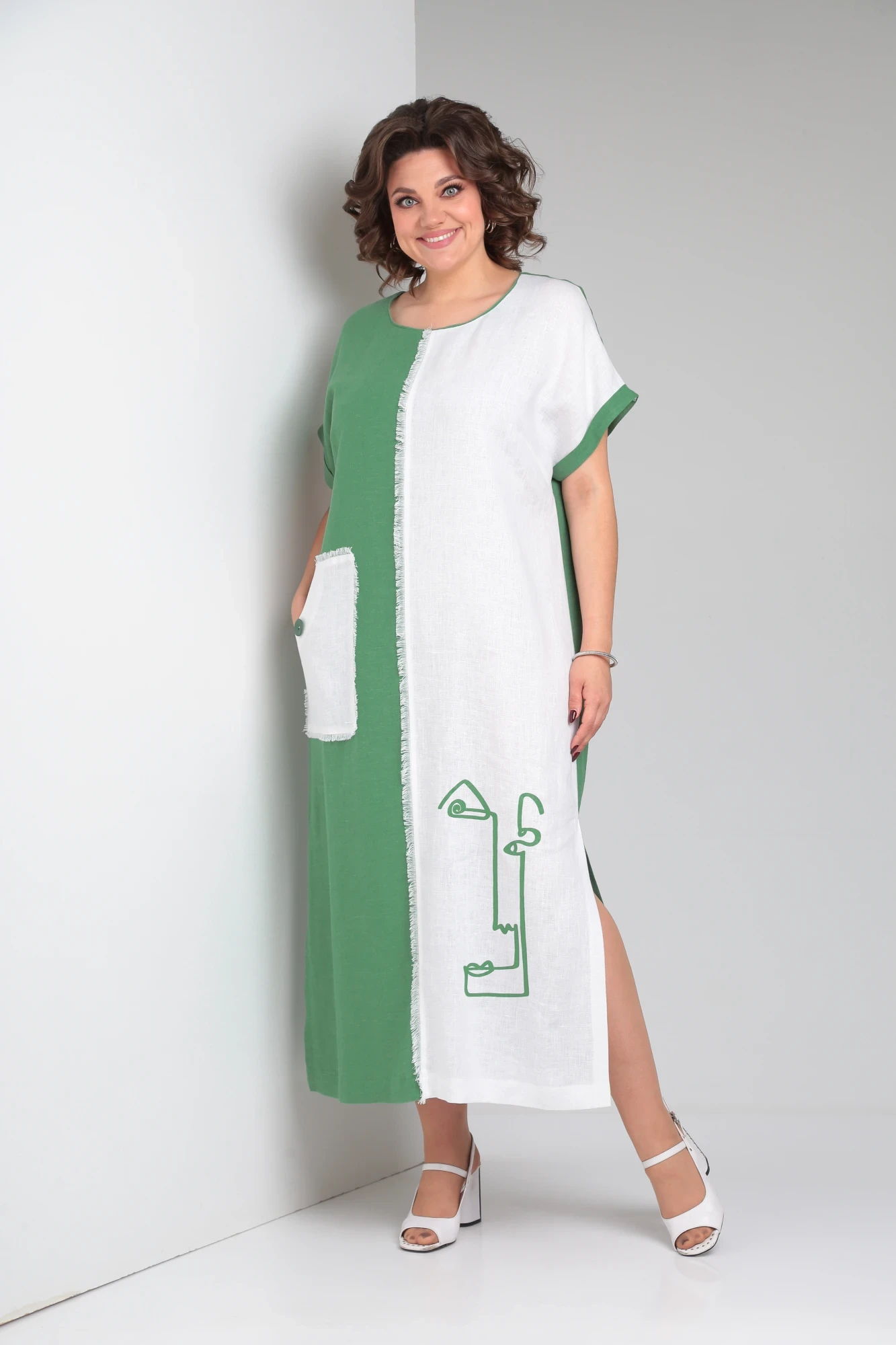 Белорусский лён - король среди летних тканей. Стильное модное длинное платье, обеспечивает комфорт и ощущение свежести в течение дня. Имеет уникальный дизайн, совмещаюший в себе элегантность и практичность. Платье в длине maxi имеет свободный оверсайз крой, со спущенным коротким рукавом с отложной манжетой, что придаёт этому платью особое очарование и удобство в движении. Особенностью является настрочной карман с бахрамой и декоративной пуговицей, центральный шов платья так же оформлен бахрамой, что придаёт платью воздушность и нежность. Так же стильная печать на левой стороне платья создаёт неповторимый образ и подчёркивает индивидуальность.