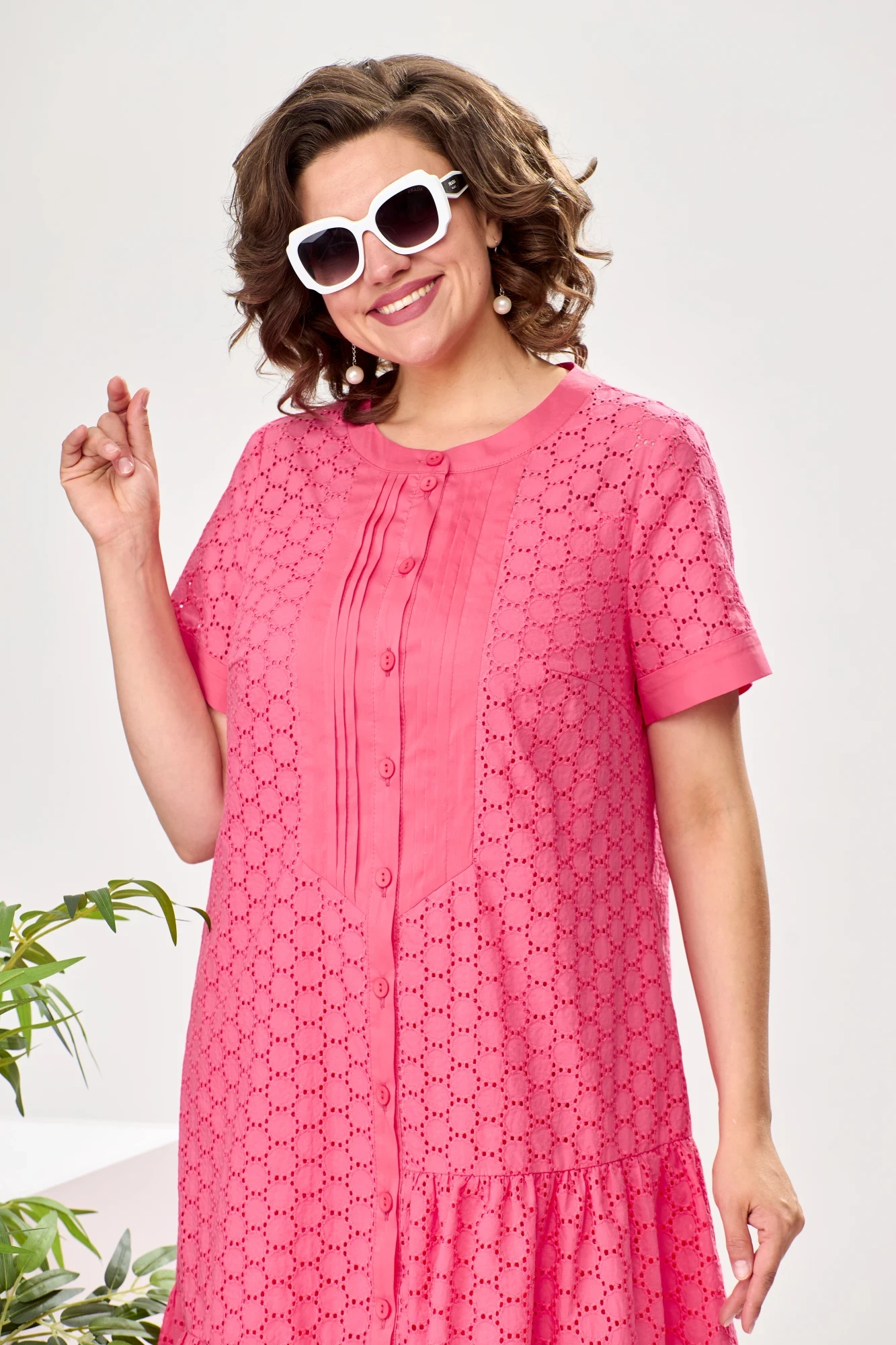Платье женское, А-силуэта, длиной до середины колена. Перед с 2-мя отрезными кокетками с 2-мя нагрудными вытачками, с 2-мя ассиметричными частями переда с приточными по низу воланами, с 2-мя приточными вертикальными планками из отделочной ткани, с 2-мя декоративными вставками из отделочной ткани, с 2-мя защипами шириной 1,0 см с каждой стороны. Спинка с отрезной кокеткой, с 2-мя таллиевыми вытачками, по низу с приточным воланом, с лёгкой сборкой по верхнему срезу. Горловина круглая, с втачной плоско-лежащей стойкой. Застёжка центральная на 11-ть обмётанных вертикальных петель и 11-ть пришивных пуговиц. Рукав втачной, короткий, одно шовный, с приточной манжетой из отделочной ткани. Платье на подкладке. Платье без плечевых накладок. Длина спинки 99 см, длина рукава 23 см.