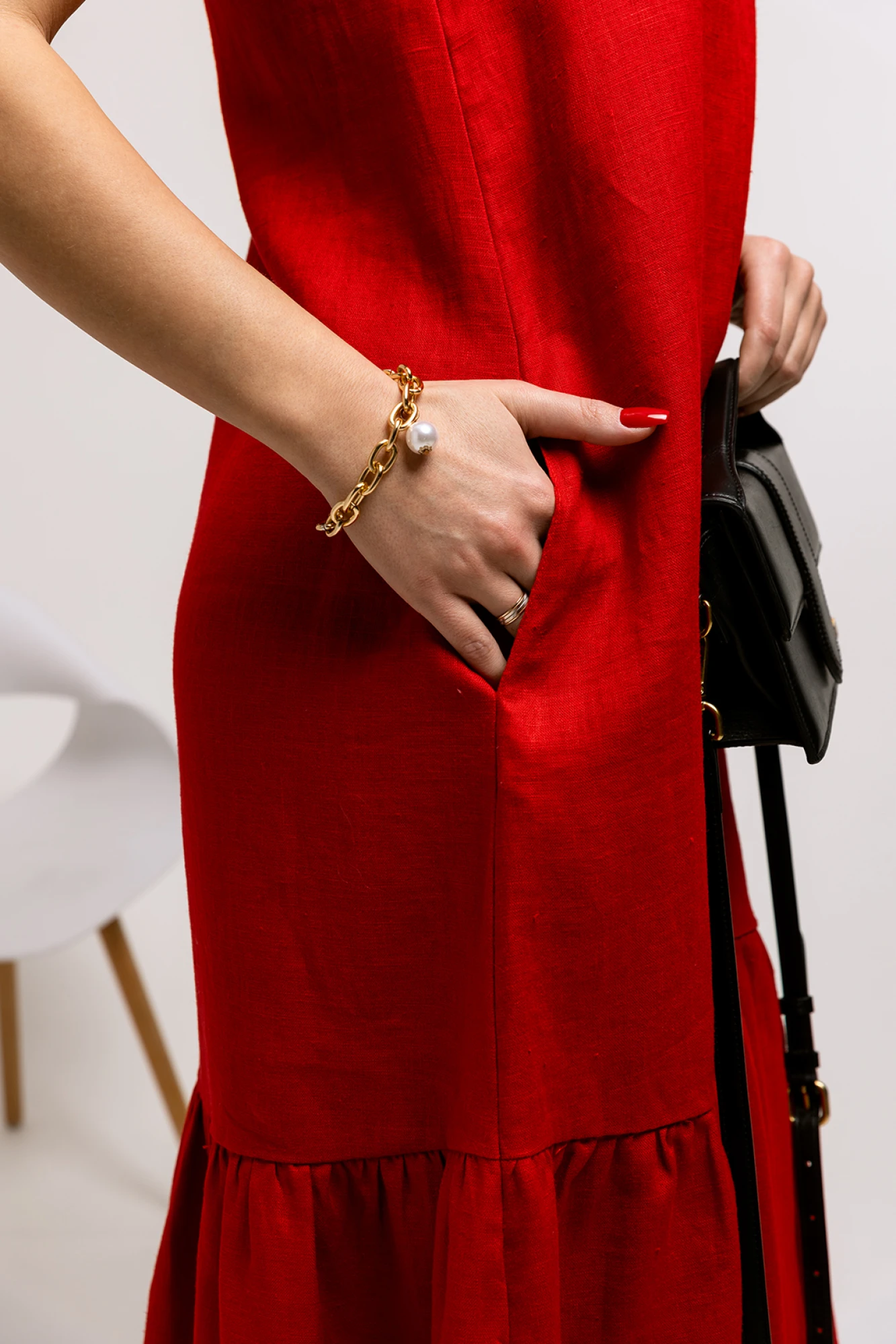 Платье А-образного силуэта, без рукавов. Форма горловины круглая. Длина платья миди. Вырез горловины и проймы окантованы бейкой из основной ткани. Платье изготовлено из ткани, в составе которой лен 100%.