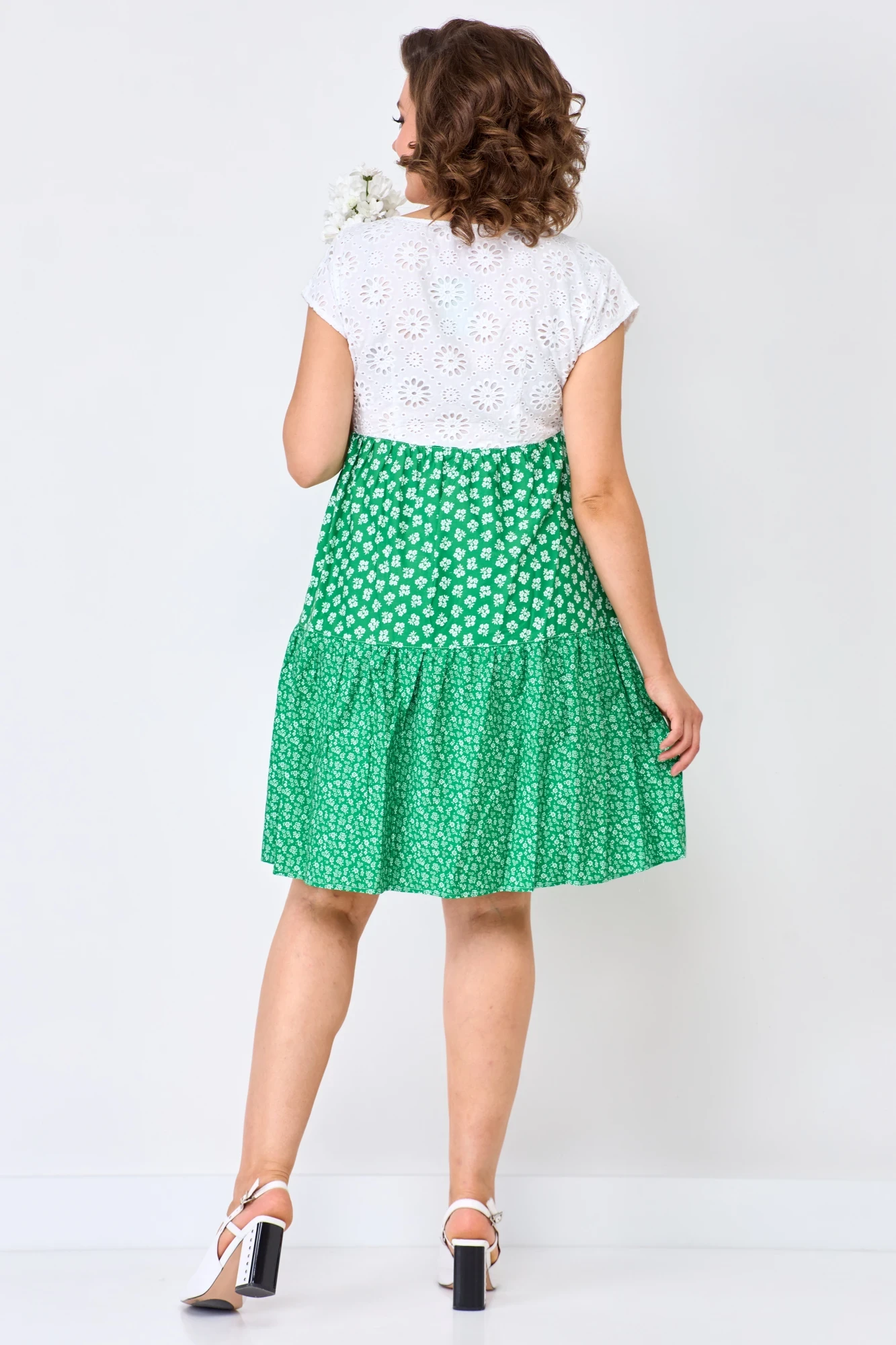 Платье женское из хлопковой ткани отрезное чуть выше линии талии. Нижняя часть платья состоит из 2 воланов на сборке. По лифу переду нагрудные вытачки идущие от низа. По центру лифа спинки односторонняя складка, которая декорирована пришивными пуговицами. Лиф спинки с талиевыми вытачками. Горловина округлая, рукав цельнокроеный, спущенный, типа «кимоно». Застежка - потайная молния в боковом шве. Украшением платья служит брошь - бабочка. Деликатная стирка при 30 градусах!