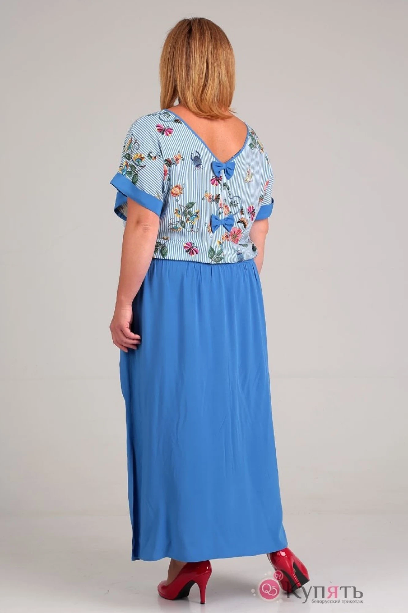 платье женское, с заниженной линией талии. Плечо спущено. К пройме притачивается отворачивающийся манжет. Горловина по полочке круглая, а по спинке углом и окантована. По центральному шву спинки пришиты два отделочных бантика. Пояс двойной и внутри по кругу протянутый шнур, концы которого выводятся через блочки по центру переда. По бокам юбки обработаны закругленные карманы.