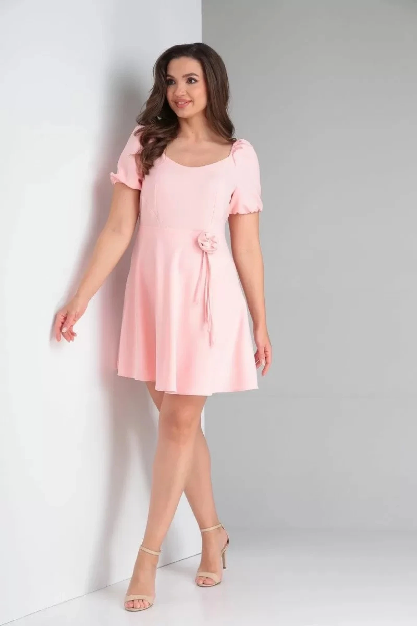 Платье выполнено из яркой, стрейчевой ткани «барби», хорошо держащей форму.