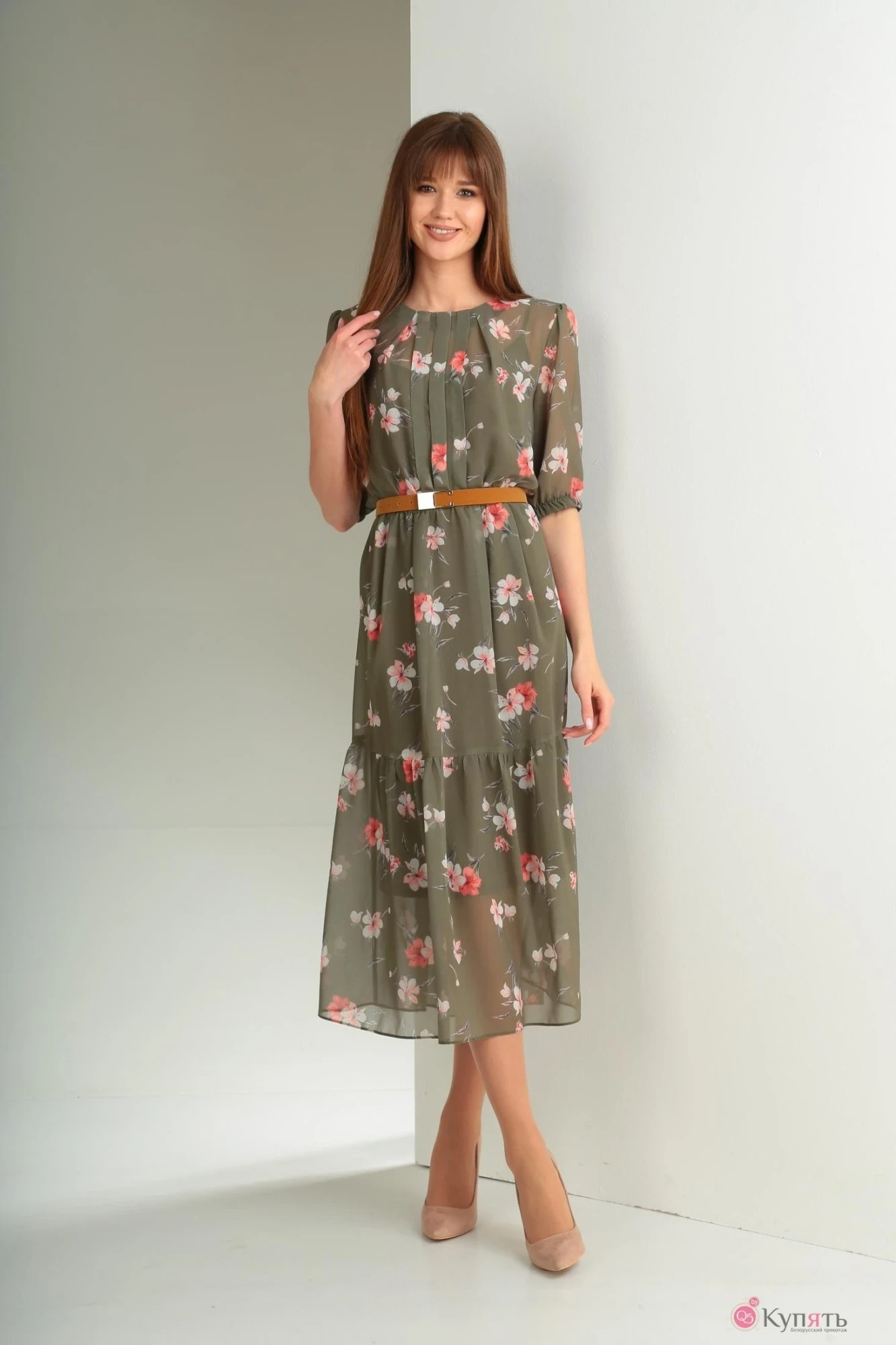 Платье женское нарядное свободного покроя, отрезное по линии талии, присобрано на эластичную тесьму, из плательной ткани(шифон). По лифу переда по центру 3 складки; нагрудная вытачка переведена в горловину в виде складки. По лифу спинки кокетка, в среднем шве застёжка на петлю-пуговицу; по линии притачивания к кокетке – сборка по центру. Низ переда и спинки с отрезным воланом по низу; по талии складки. Рукав втачной ¾ со сборкой по окату, низ присобран на широкую эластичную тесьму(2,5 см). Горловина округлой формы, обработана обтачкой по переду, по спинке окантована. Изделие на подкладке(отдельное платье на бретелях, длина по средней линии спинки – 105 см).