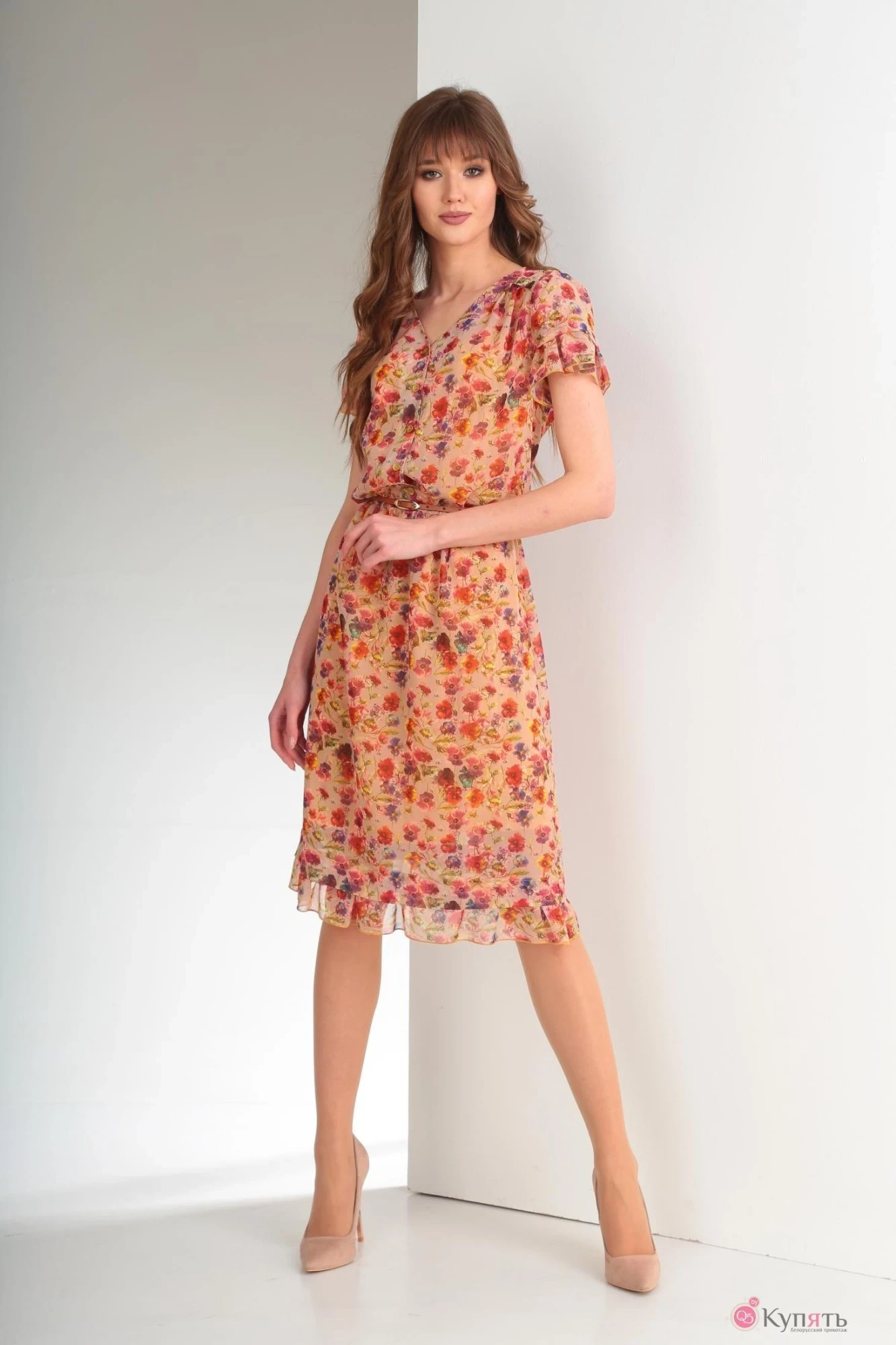 Платье женское полуприлегающего силуэта из лёгкой плательной ткани(шифон), отрезное по линии талии, слегка присобрано на эластичную тесьму. По лифу переда: центральная застёжка с прорезными петлями и пуговицами; нагрудная вытачка переведена в складки в сторону плеча, в линию притачивания к кокетке. Горловина V-образной формы, обработана подбортом; по спинке окантована. По спинке кокетка, по центру спинки небольшая сборка по линии притачивания кокетки. Низ переда, спинки, рукава с притачной рюшей из основной ткани с эффектом многослойности. По окату рукава сборка. Изделие на подкладке(отдельное платье на бретелях, длина по средней линии спинки – 100 см).