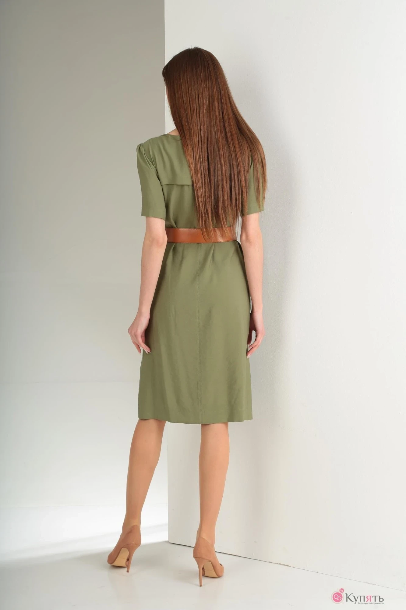 Платье женское из плательной ткани в стиле «сафари», прямого силуэта. По переду: нагрудная вытачка перенесена в складку по горловине; отделочная планка с закрепками со вставленной молнией. По спинке: средний шов, кокетка с отлетным низом. Рукав втачной(25 см); подгибка низа 3 см; по окату сборка. На боковых швах накладные карманы с клапаном, закрепкой и декоративной нашивкой. Низ платья с широкой подгибкой(5 см). Горловина округлой формы, обработана обтачкой; в комплект входит съёмный пояс.