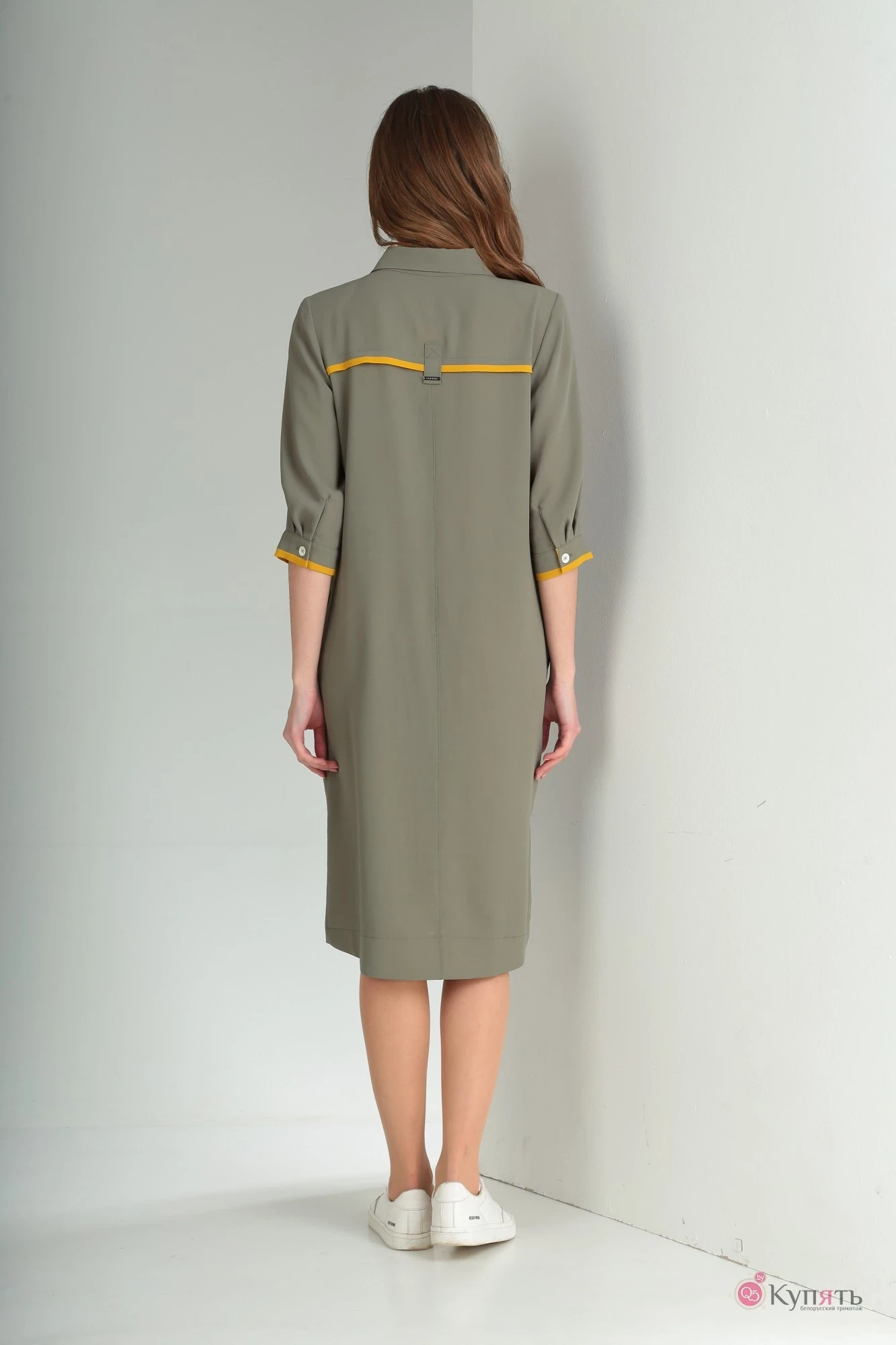 Платье женское из плательной ткани свободного кроя. По переду: кокетки; нагрудная вытачка от кокетки, под карманом, по центру планка, которая служит застёжкой на петли-пуговицы; по низу отделочная деталь с имитацией застёжки на 2 петли-пуговицы. По спинке: кокетка с отделочной планкой и патой; средний шов; низ спинки фигурный, обработан обтачкой. В боковых швах карманы с отделочными закрепками. Рукав втачной одношовный, снизу манжета с отделочным кантом. По горловине воротник на стойке. Нижняя стойка, нижняя планка, отделочные канты карманов и манжеты, отделочная планка по спине, обтачка низа – из отделочной ткани.