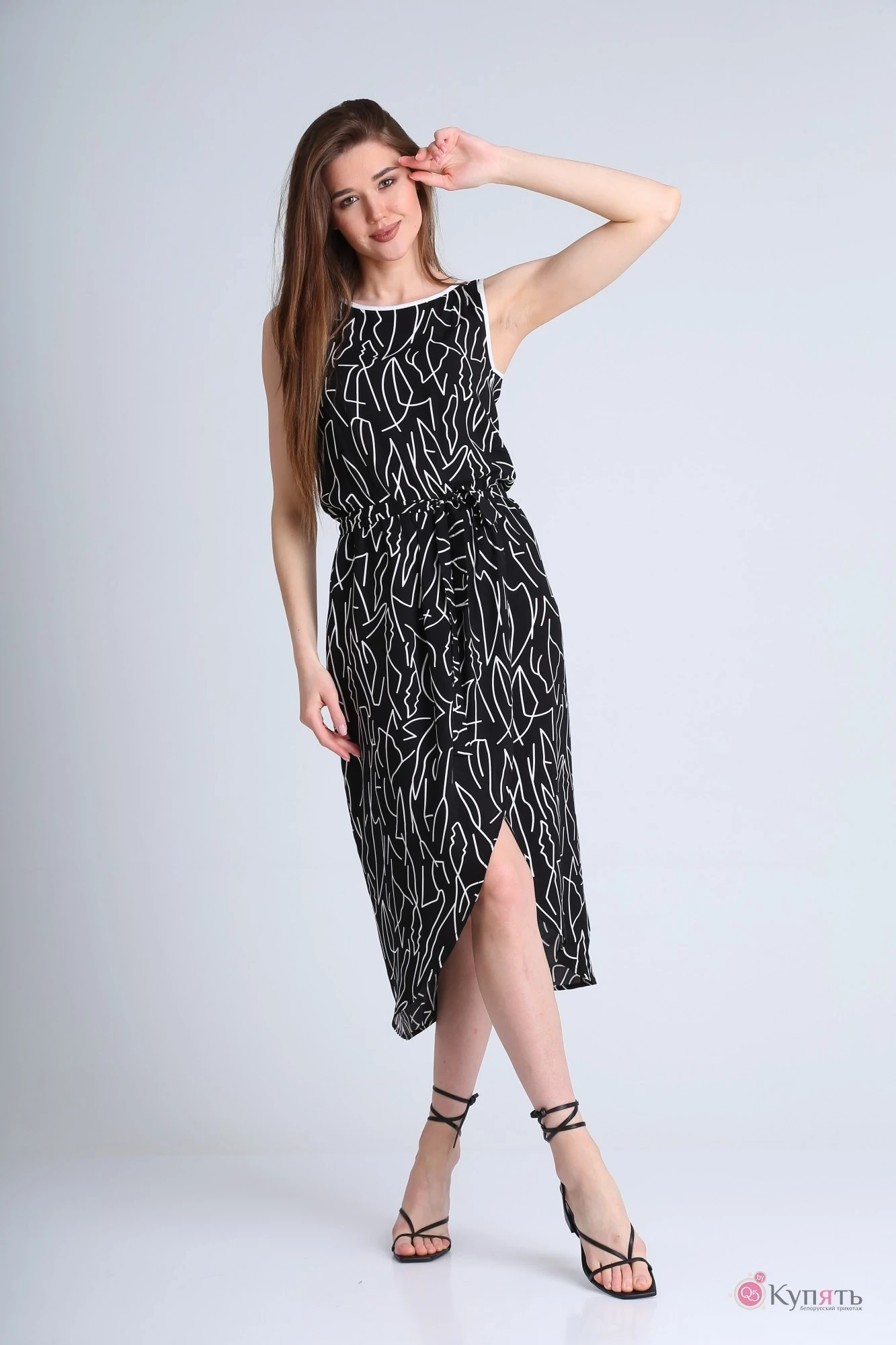 Платье женское с запахом в юбочной части. Горловина и пройма окантованы отделочной тесьмой. По линии талии на переднем полотнище две мягкие складки. Без рукавов. Пояс в комплекте. Длина изделия 127 см (для роста 164 см)/ 130см (для роста 170 см).