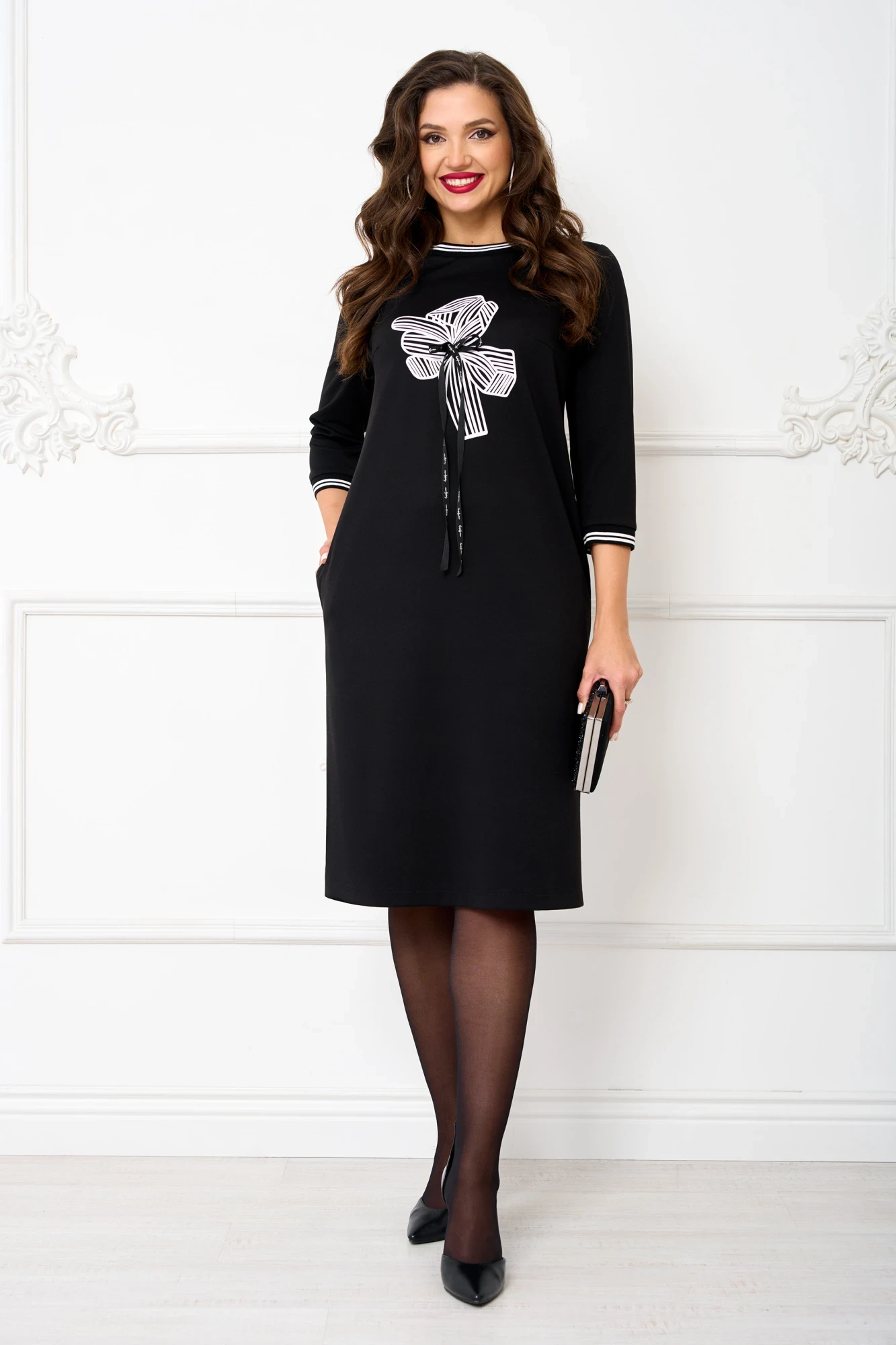Стильное женское платье полуприлегающего силуэта, выполнено из высококачественной трикотажной ткани с добавлением вискозы (ткань мягкая, приятная к телу, хорошо тянется). Горловина платья округлая, с отделкой из трикотажного довяза. Перед платья украшен стильной дизайнерской печатью и декором в виде банта. В боковых швах платья функциональные карманы. Рукава втачные, манжета из трикотажного довяза. Модель платья удобная и практичная, невероятно стройнит, прекрасно подойдет для ежедневной носки.