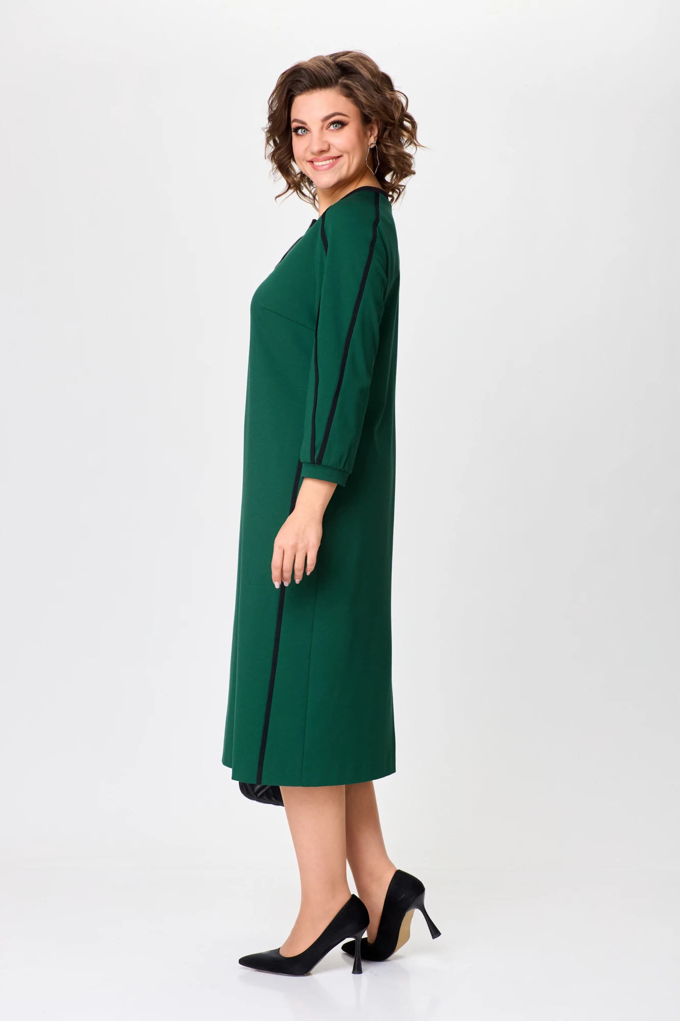 Стильное и комфортное платье из трикотажного полотна идеально подойдёт как для повседневных образов, так и для работы в офисе. Платье с контрастными кантами по рукаву реглан и по переду изделия. Вырез горловины фигурный с декоративной молнией. По переду карманы в швах. Спинка без особенностей.