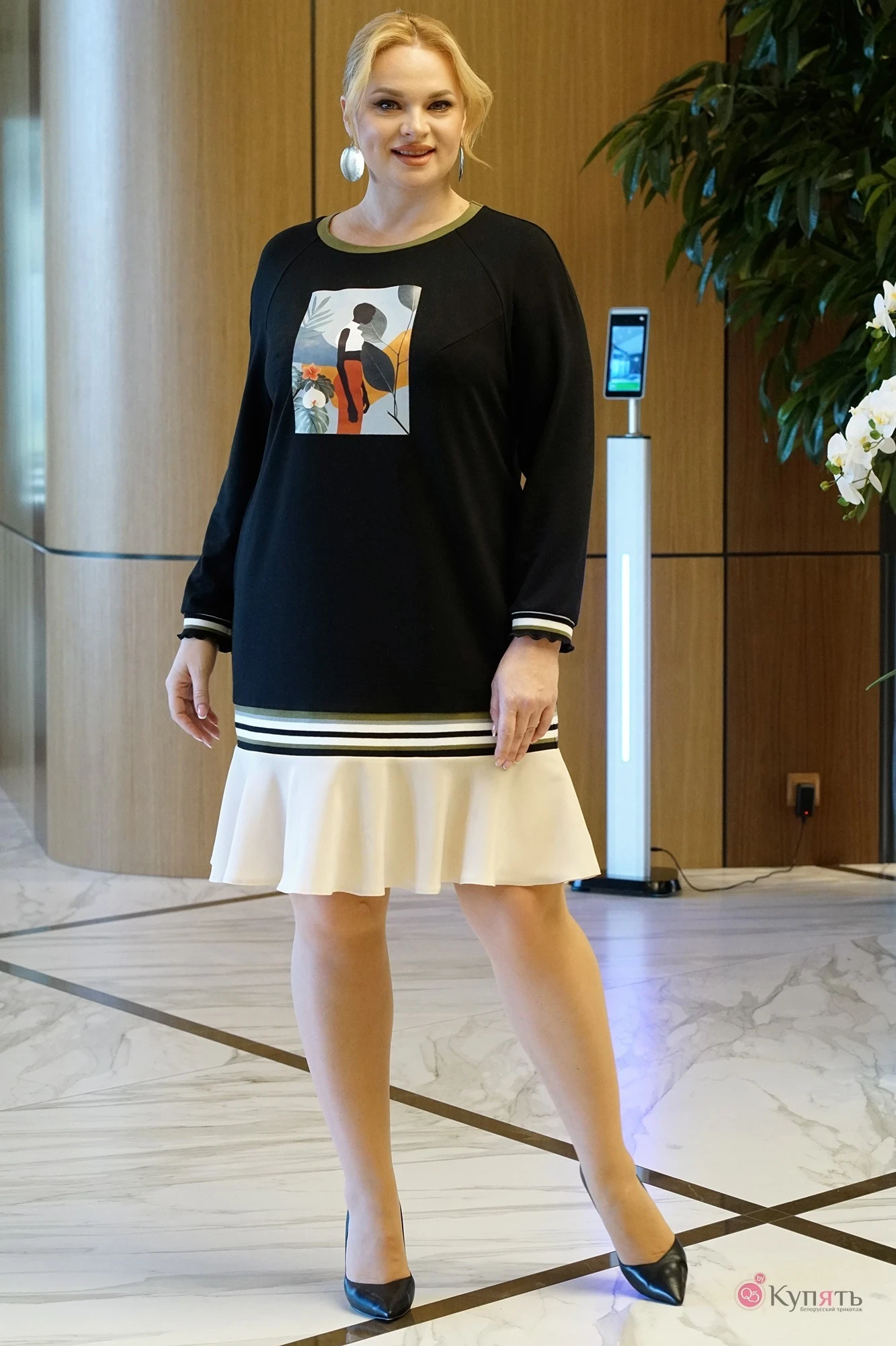 Платье прямого силуэта с притачным воланом и отделочной планкой по низу. Перед с нагрудными вытачками. Спинка со средним швом. Рукава одношовные с притачными манжетами. Горловина округлой формы с притачной бейкой. Бейка горловины, манжеты, отделочная тесьма по низу платья выполнены из отделочной трикотажной тесьмы. Волан низа платья выполнен из плательно-костюмной ткани. Дополняет платье термоаппликация.