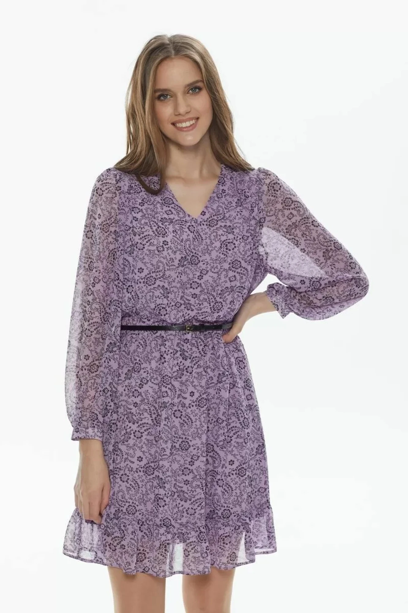 Платье отрезное по линии талии и на резинке. Низ с притачной оборкой со сборкой по шву соединения. По переду верх платья с притачными кокетками со сборкой по шву соединения. Рукава втачные, одошовные со сборкой по окату и притачными манжетами, застегивающимися на одну петлю-пуговицу. Перед и спинка платья на подкладке. Рукава без подкладки. Ремень в комплекте.