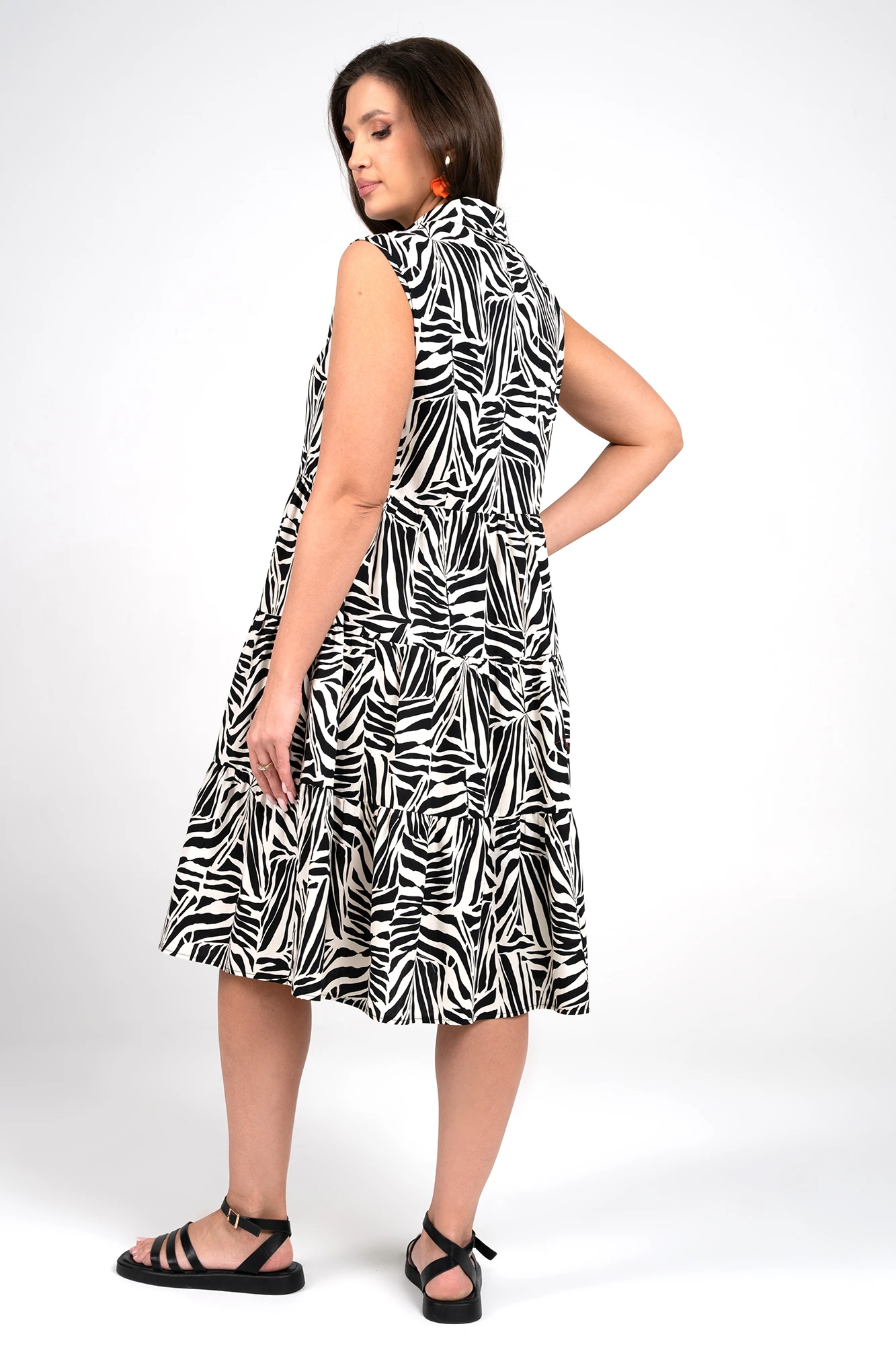 Платье верхняя часть полуприлегающего силуэта, нижняя из трёх воланов собранных на сборку, с застёжкой по плаке на петли, пуговицы, чуть спущенное плечо. Перед с нагрудными выточками. Спинка с талевыми выточками. Воротник стояще-отложной на отрезной стойке застёгивающийся на петлю, пуговицу.